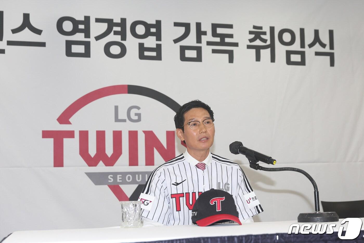 프로야구 LG 트윈스 염경엽 신임 감독이 14일 오후 서울 잠실야구장에서 열린 취임식에서 인사말을 하고 있다. (LG 트윈스구단 제공)2022.11.14/뉴스1