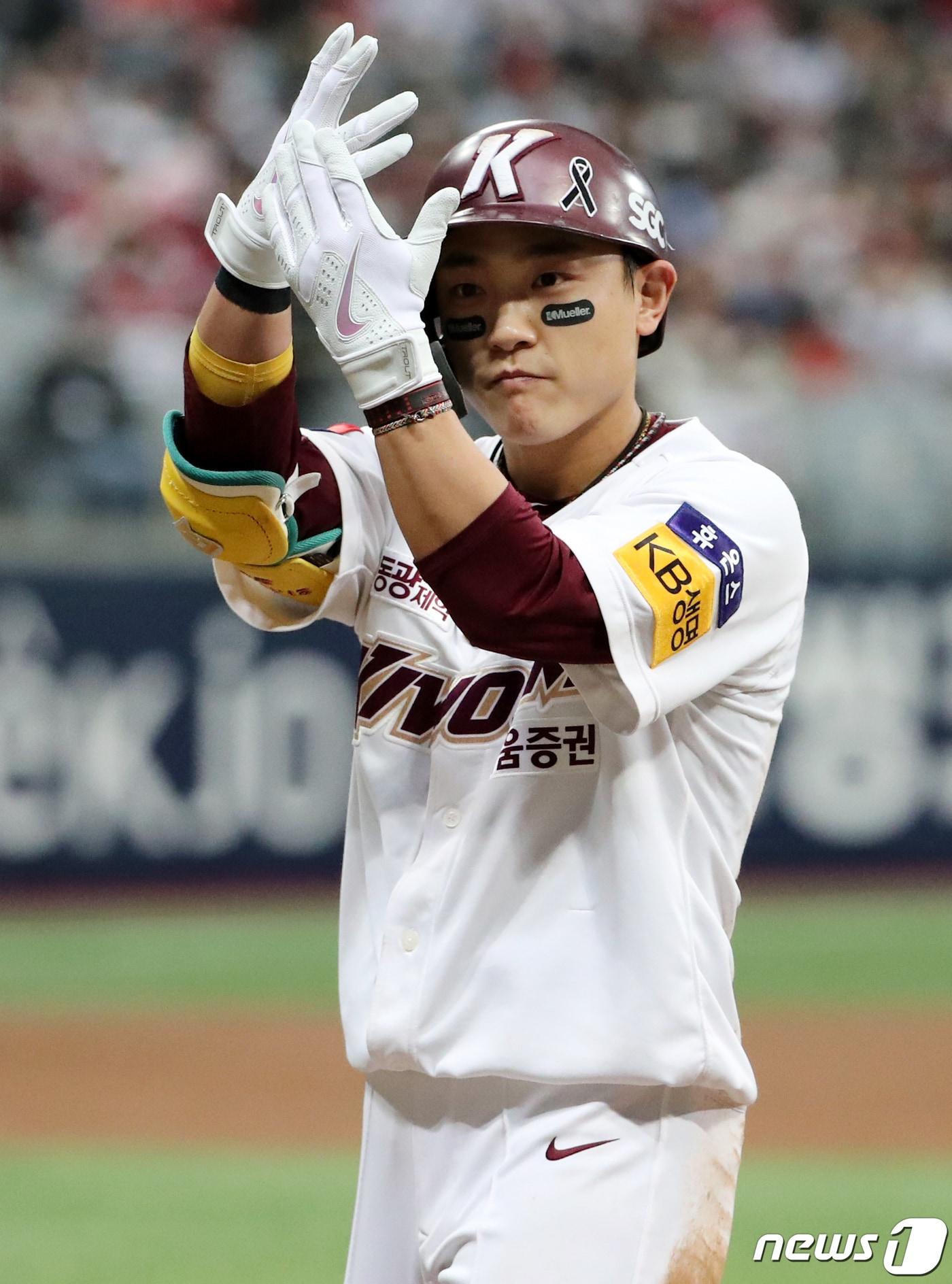 5일 오후 서울 구로구 고척스카이돔에서 열린 프로야구 '2022 신한은행 SOL KBO 포스트시즌' 한국시리즈 4차전 SSG 랜더스와 키움 히어로즈의 경기, 키움 김태진이 3회말 1사 1루에서 안타를 친 후 세리머니를 하고 있다. 2022.11.5/뉴스1 ⓒ News1 김진환 기자