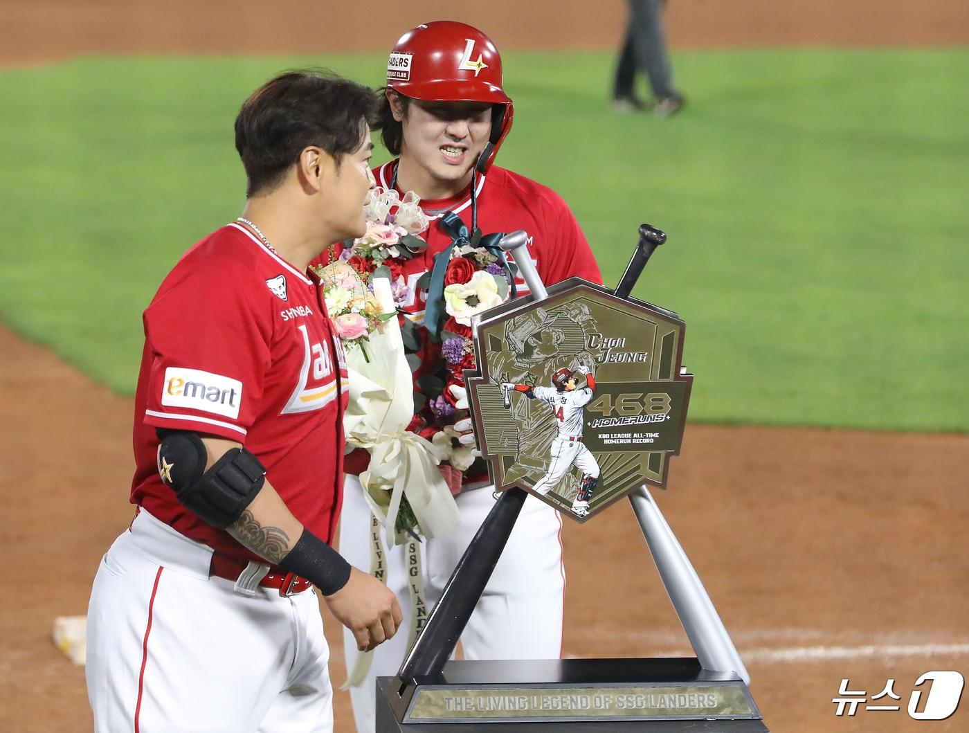 24일 오후 부산 사직야구장에서 열린 '2024 신한 SOL 뱅크 KBO리그' 롯데 자이언츠와 SSG 랜더스의 경기, 5회초 2사 주자 없는 상황 SSG 최정이 468호 홈런으로 KBO리그 통산 최다 홈런 신기록을 달성한 뒤 꽃다발을 들고 추신수와 기쁨을 나누고 있다. 2024.4.24/뉴스1 ⓒ News1 윤일지 기자