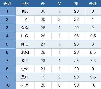 프로야구 중간 순위. ⓒ News1