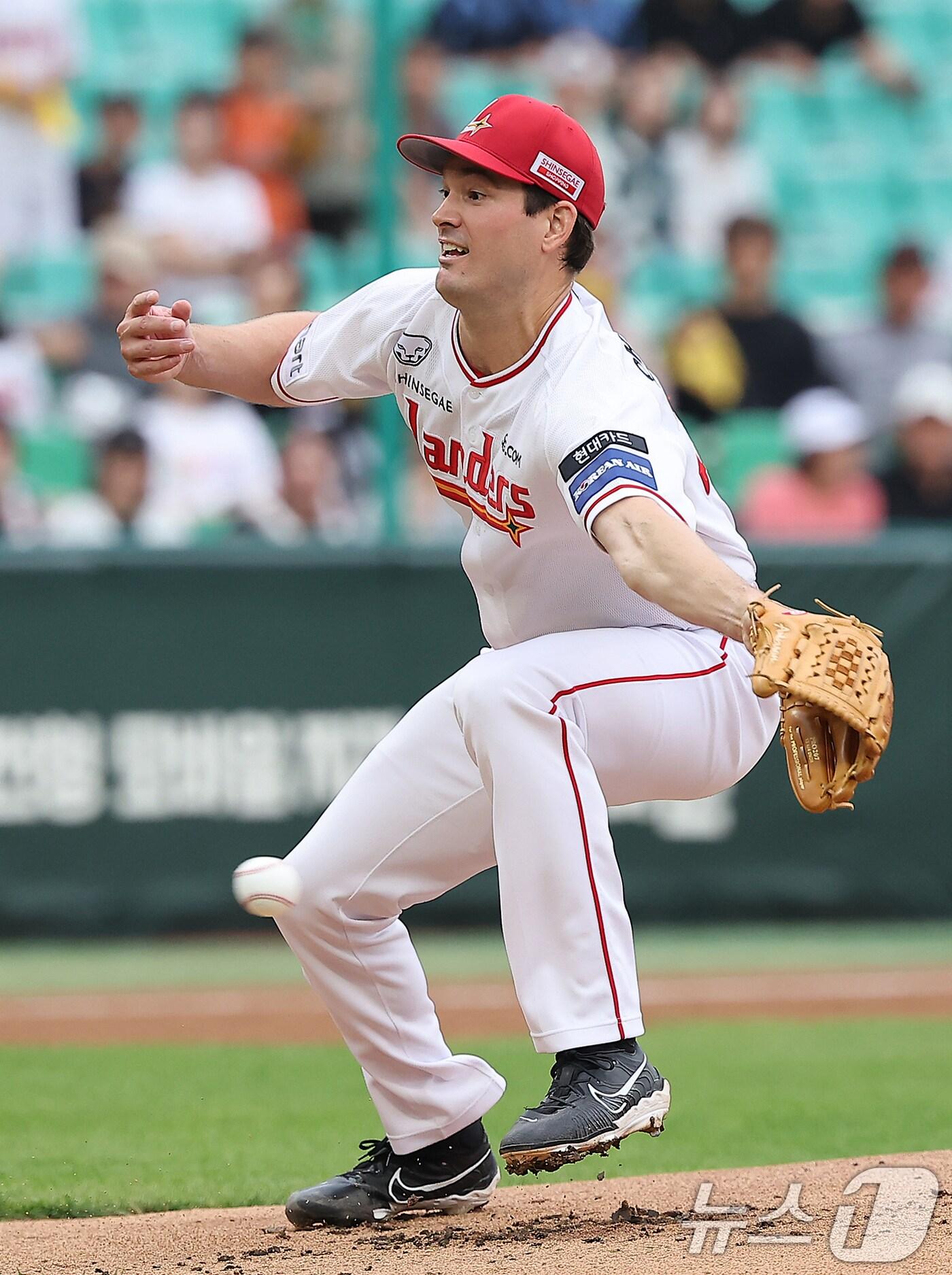 30일 오후 인천시 미추홀구 문학동 SSG랜더스필드에서 열린 프로야구 '2024 신한 SOL 뱅크 KBO리그' LG 트윈스와 SSG 랜더스의 경기, SSG 선발 앤더슨이 1회초 2사 2루 상황 LG 오스틴의 타구를 잡기 위해 팔을 뻗고 있다. 2024.5.30/뉴스1 ⓒ News1 김진환 기자