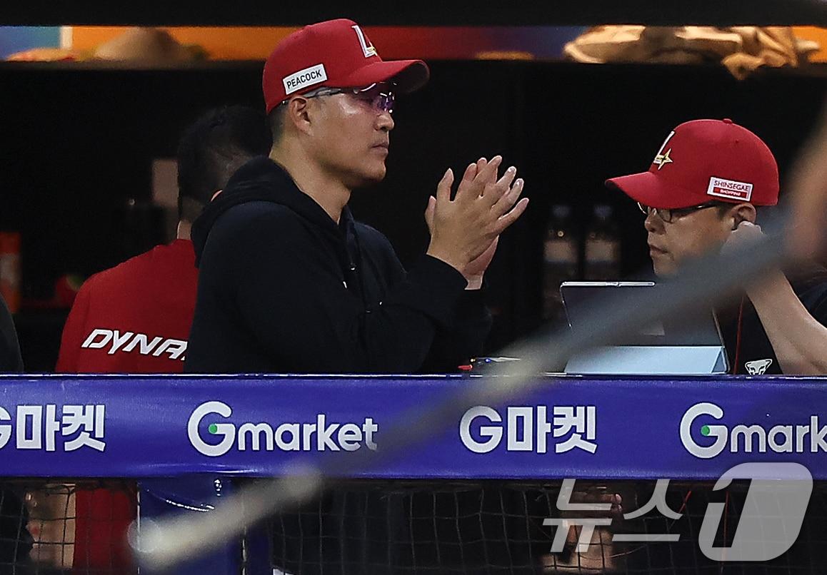 30일 오후 인천시 미추홀구 문학동 SSG랜더스필드에서 열린 프로야구 '2024 신한 SOL 뱅크 KBO리그' LG 트윈스와 SSG 랜더스의 경기, SSG 이숭용 감독이 8회초 실점 없이 이닝을 마친 뒤 손뼉을 치고 있다. 2024.5.30/뉴스1 ⓒ News1 김진환 기자