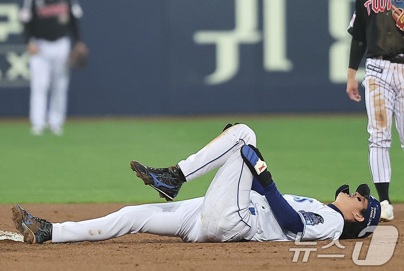15일 오후 대구 삼성라이온즈파크에서 열린 프로야구 '2024 신한 SOL 뱅크 KBO 포스트시즌' 플레이오프 2차전 LG 트윈스와 삼성 라이온즈의 경기, 삼성 구자욱이 1회말 2사 1루 상황에서 2루 도루를 성공시킨 뒤 고통스러워 하고 있다. 2024.10.15/뉴스1 ⓒ News1 김진환 기자