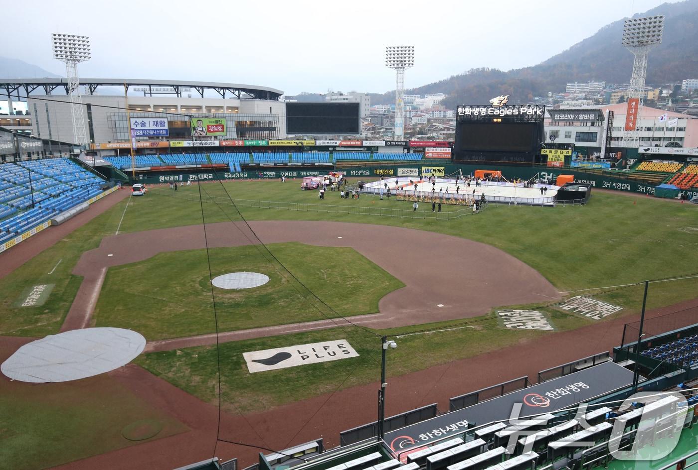 29일 대전 중구 한화생명 이글스파크 내 설치된 아이스링크에서 한화이글스 팬들이 스케이트를 타며 즐거운 시간을 보내고 있다. 이글스파크 건너편에 신축 중인 야구장. 2024.11.29/뉴스1 ⓒ News1 김기태 기자
