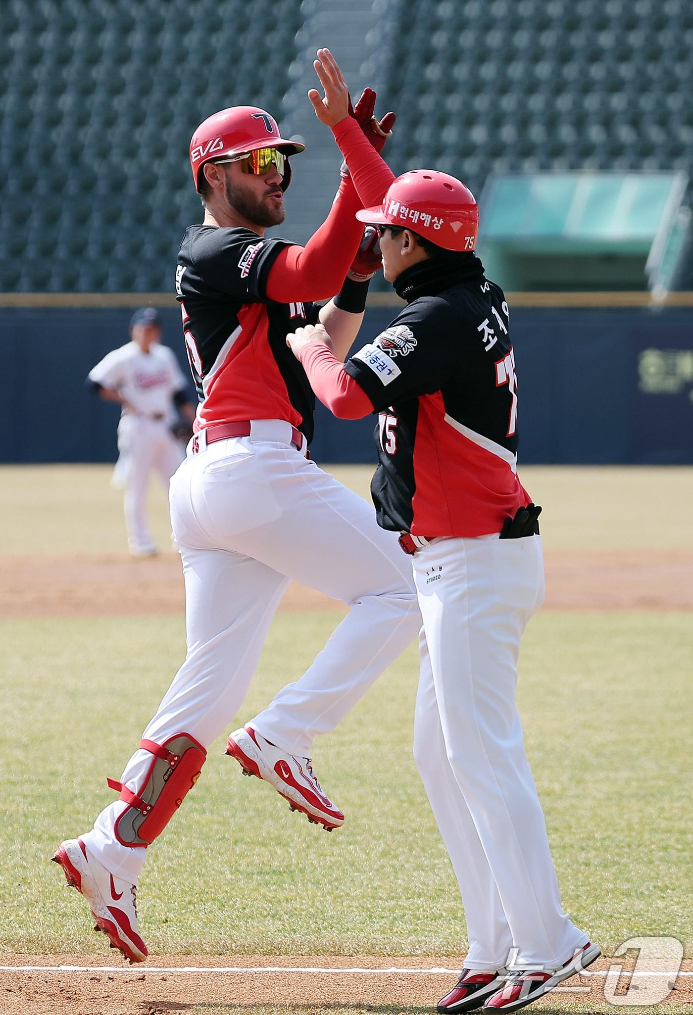 14일 서울 송파구 잠실야구장에서 열린 2025 프로야구 KBO리그 KIA 타이거즈와 두산 베어스의 시범경기, KIA 외국인 타자 위즈덤이 1회초 1사 3루에서 투런 홈런을 친 뒤 조재영 코치와 하이파이브를 하고 있다. 2025.3.14/뉴스1 ⓒ News1 김진환 기자