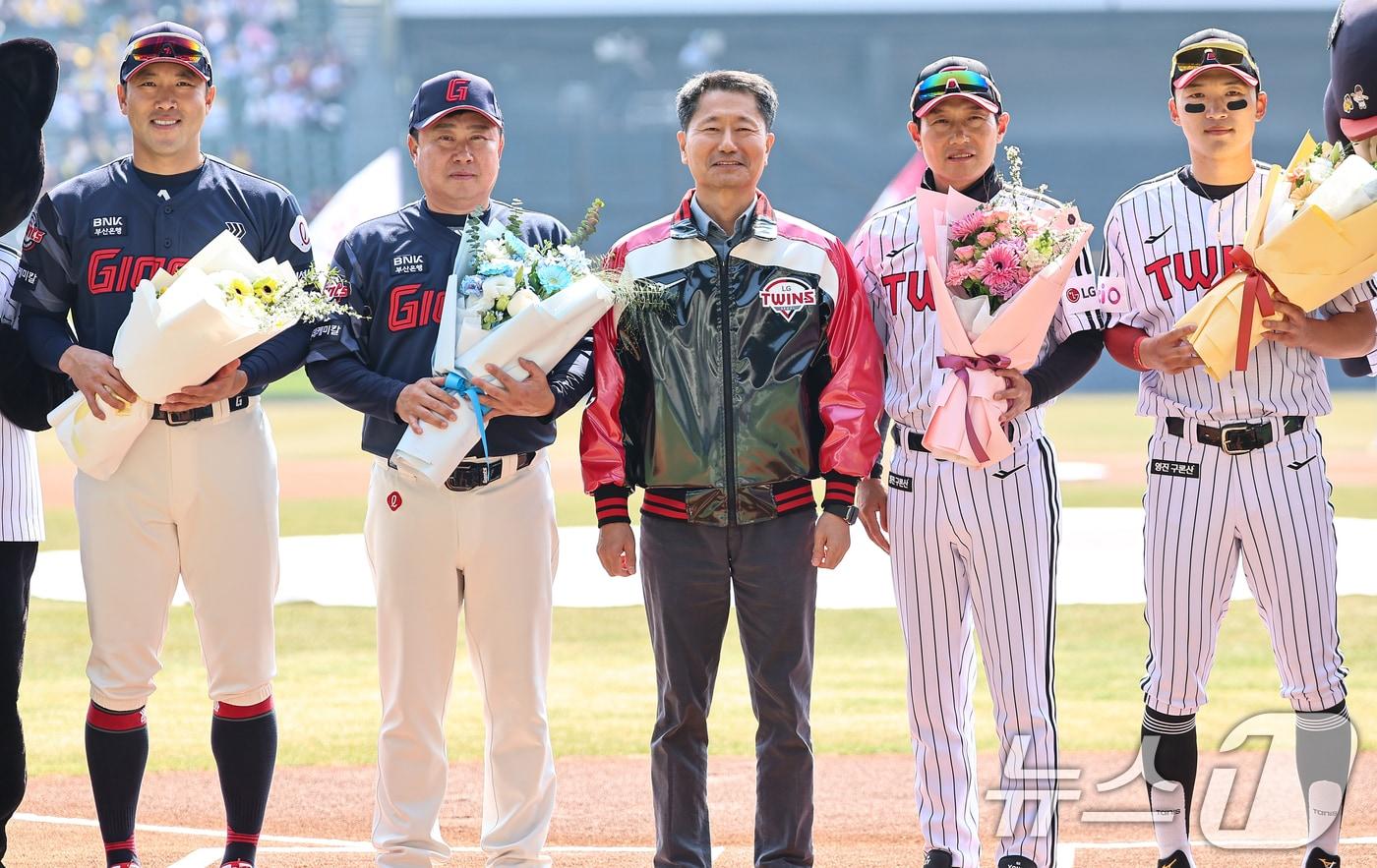 LG 스포츠 김인석 대표이사가 22일 서울 송파구 잠실야구장에서 열린 '2025 신한 SOL 뱅크 KBO리그' 개막전 롯데 자이언츠와 LG 트윈스의 경기에 LG염경엽 감독과 롯데 김태형 감독에게 꽃다발을 전달 후 기념촬영 하고 있다. 2025.3.22/뉴스1 ⓒ News1 김도우 기자