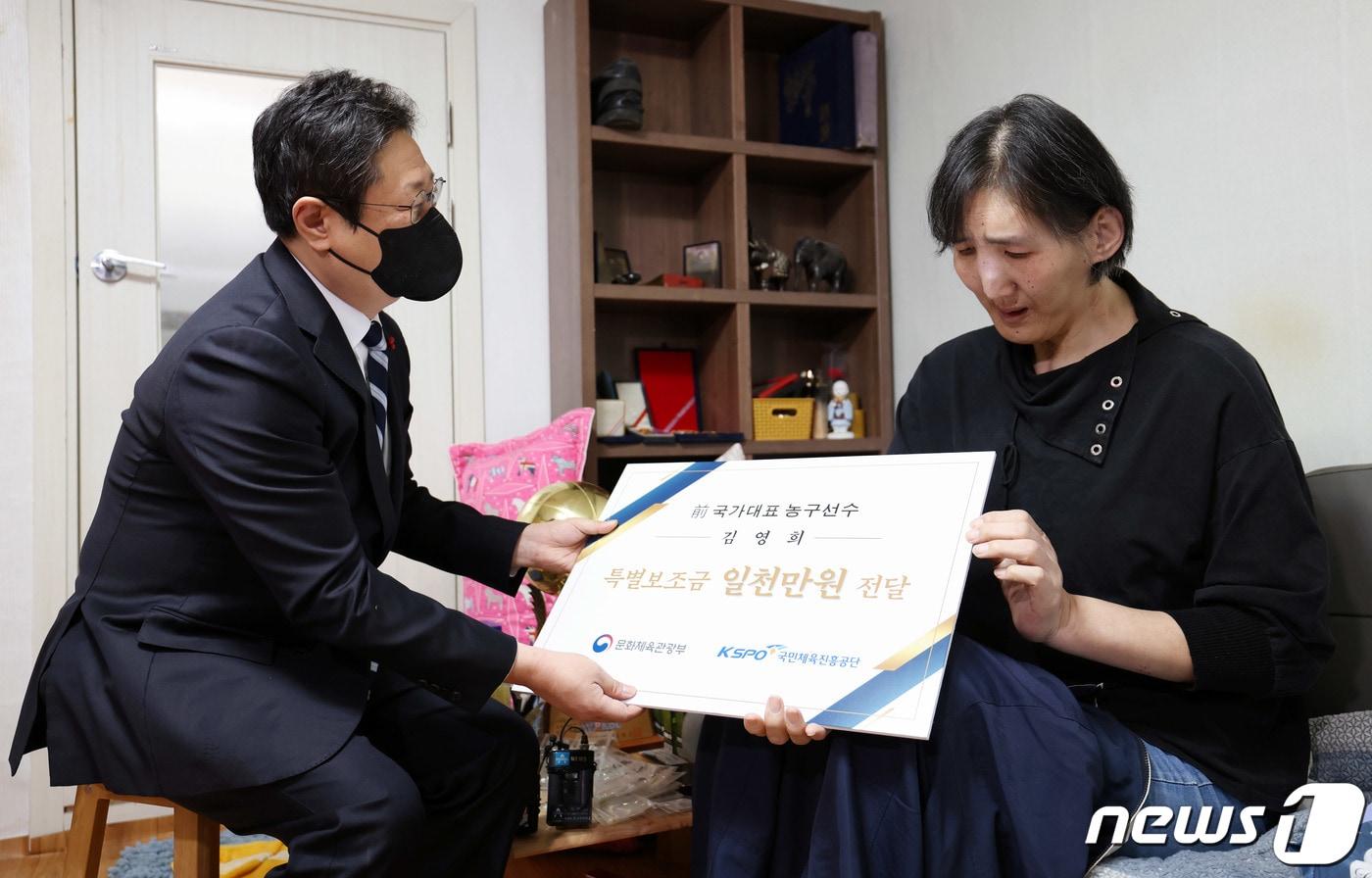 황희 문화체육관광부 장관이 29일 말단비대증으로 투병 중인 올림픽 여자농구 메달리스트 김영희 씨의 경기도 부천시 자택을 방문, 특별보조금 1000만원을 전달하고 있다. (문화체육관광부 제공) 2021.12.29/뉴스1