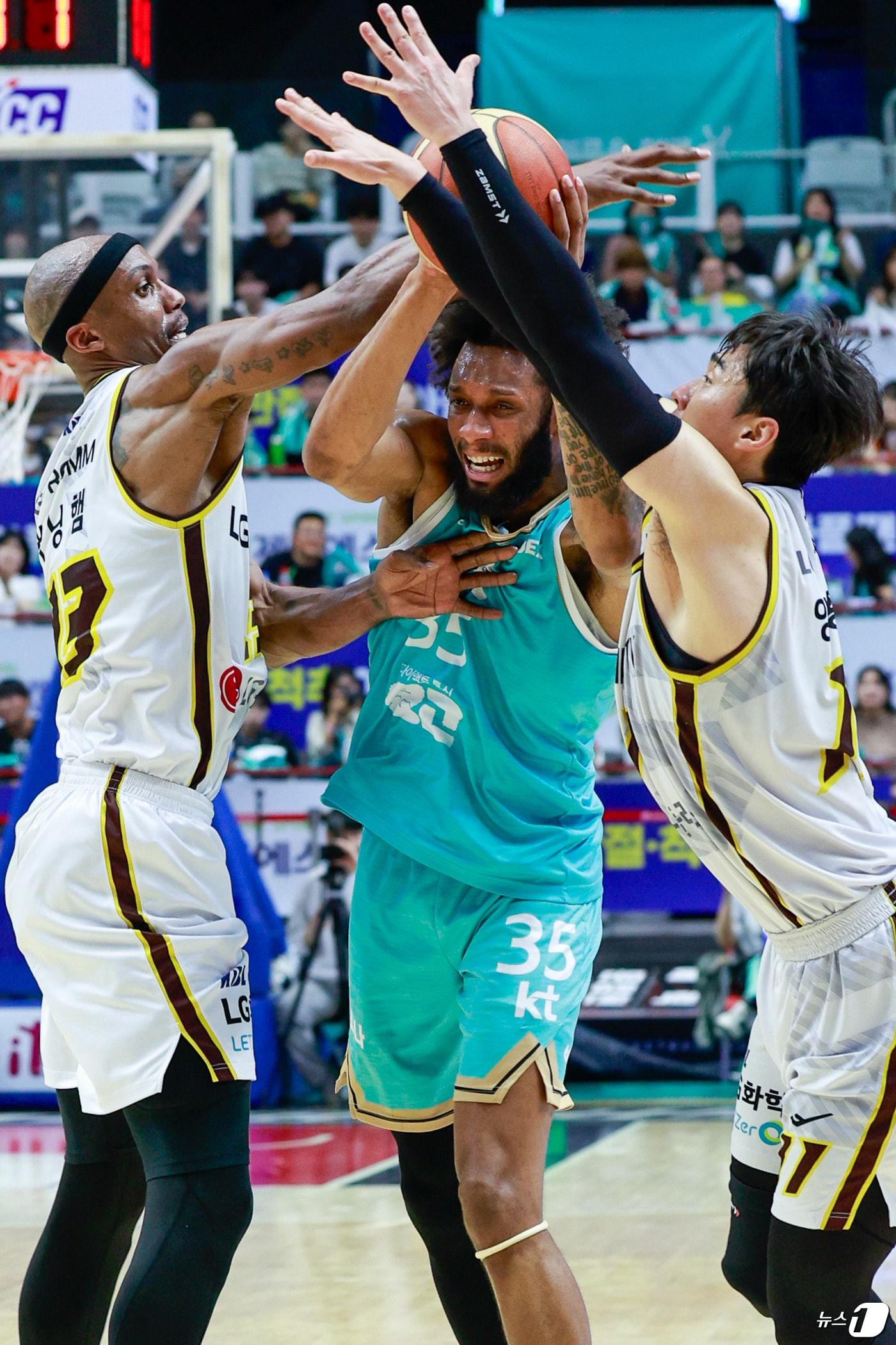 22일 오후 경기 수원KT소닉붐아레나에서 열린 2023-24 KBL 정관장 프로농구 4강 플레이오프 4차전 수원 KT 소닉붐과 창원 LG 세이커스의 경기, KT 패리스 배스가 LG 양홍석과 커닝햄의 수비에 둘러싸여 있다. 2024.4.22/뉴스1 ⓒ News1 안은나 기자