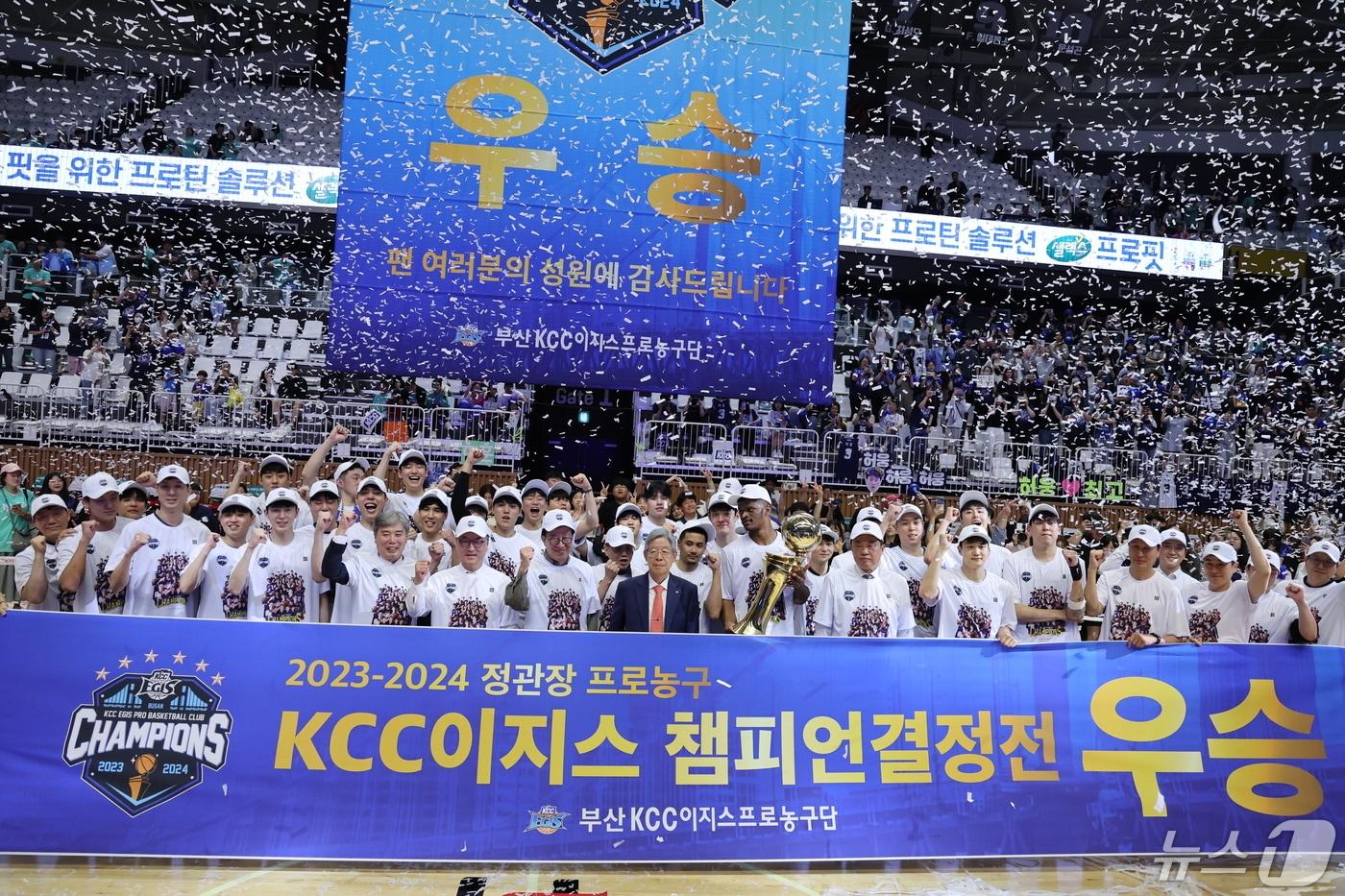 5일 오후 경기도 수원시 권선구 수원KT소닉붐아레나에서 열린 '2023-2024 정관장 프로농구' 챔피언결정전 5차전 수원 KT와 부산 KCC의 경기에서 우승을 차지한 KCC 선수들이 기뻐하고 있다. 2024.5.5/뉴스1 ⓒ News1 이재명 기자