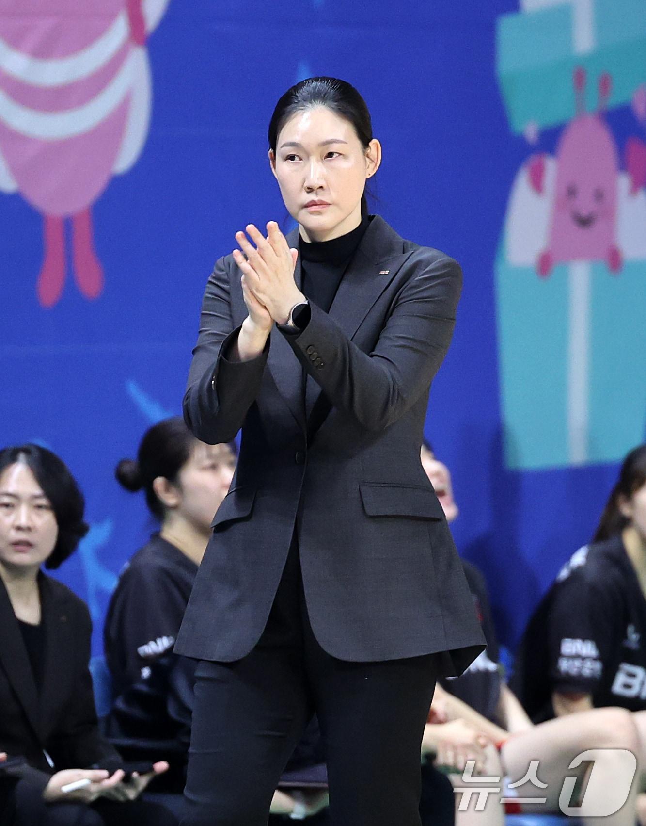 16일 오후 충남 아산 이순신체육관에서 열린 '하나은행 2024-2025 여자프로농구' 플레이오프 챔피언결정전 1차전 아산 우리은행과 부산 BNK의 경기에서 BNK 박정은 감독이 선수들을 격려하고 있다. 2025.3.16/뉴스1 ⓒ News1 오대일 기자