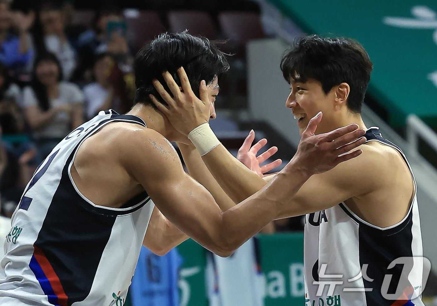 11일 오후 경기도 안양 정관장 체육관에서 열린 하나은행 초청 2025 남자농구 국가대표 평가전 대한민국과 일본의 경기에서 박지훈(오른쪽)이 덩크슛을 꽂아 넣은 여준석과 기쁨을 나누고 있다. 2025.7.11/뉴스1 ⓒ News1 박정호 기자