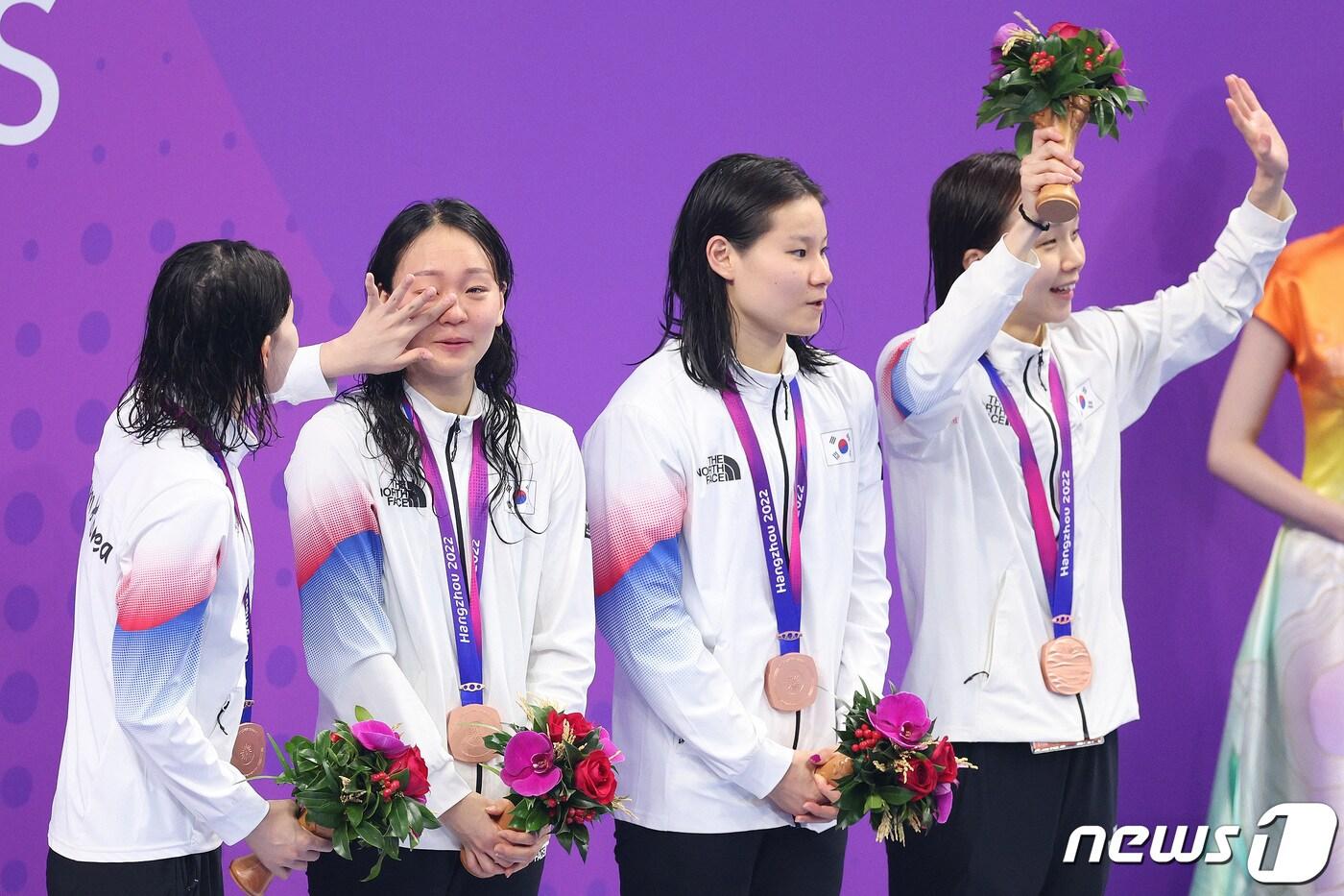 한다경(왼쪽부터), 박수진, 허연경, 김서영이 28일 중국 항저우 올림픽 스포츠센터 아쿠아틱 스포츠 아레나에서 열린 2022 항저우 아시안게임 여자 계영 800m 메달 수여식에서 단상에 오르고 있다. 2023.9.28/뉴스1 ⓒ News1 신웅수 기자