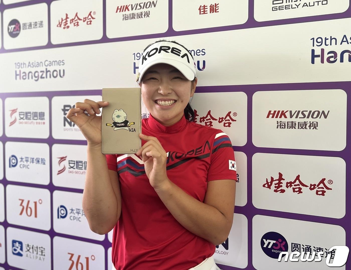 유현조가 1일 중국 항저우의 서호 국제골프코스(파72)에서 열린 2022 항저우 아시안게임 여자 골프 경기를 마친 뒤 취재진에게 자신의 스코어보드를 보여주고 있다. 유현조는 이번 대회에서 개인전 동메달, 단체전 은메달을 획득했다. 2023.10.1/뉴스1 ⓒ News1 이상철 기자