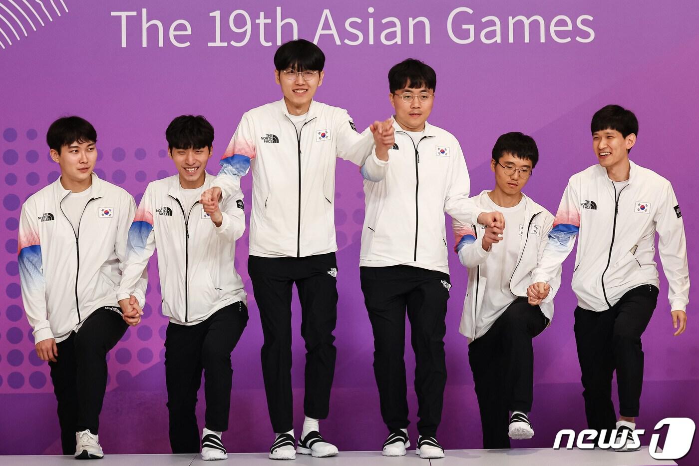 남자 바둑 대표팀 박정환(왼쪽부터), 김명훈, 신진서, 신민준, 변상일, 이지현 9단이 3일 중국 항저우 치위안 체스홀에서 열린 2022 항저우 아시안게임 바둑 남자 단체전 시상식에서 손을 맞잡고 시상대에 오르고 있다. 2023.10.3/뉴스1 ⓒ News1 유승관 기자