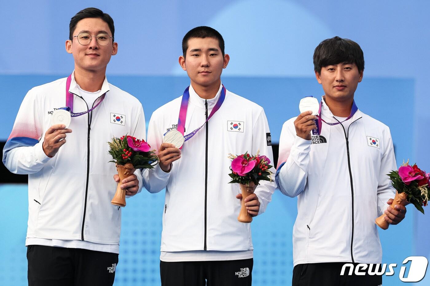 김종호(왼쪽부터), 양재원, 주재훈이 5일 중국 항저우 푸양 인후 스포츠센터 양궁장에서 열린 2022 항저우 아시안게임 양궁 컴파운드 남자 단체전 시상식 후 은메달을 들고 기념 촬영을 하고 있다. 2023.10.5/뉴스1 ⓒ News1 유승관 기자