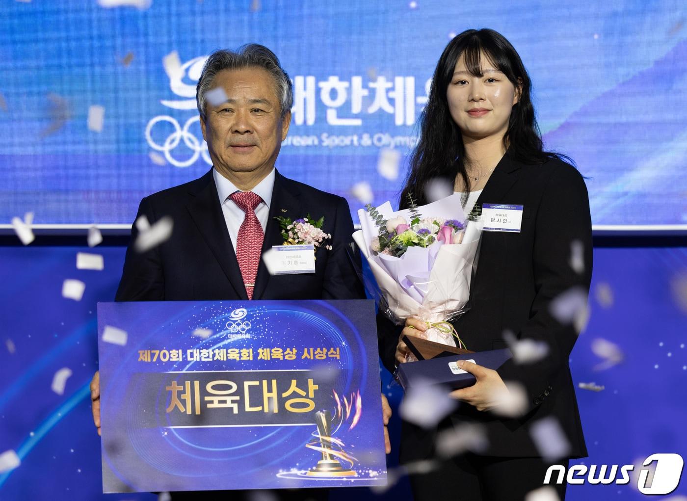 지난해 항저우 아시안게임에서 양궁 3관왕에 오른 임시현이 29일 오후 서울 송파구 올림픽파크텔에서 열린 제70회 대한체육회체육상 시상식에서 체육대상을 수상한 후 이기흥 대한체육회장과 기념 촬영을 하고 있다. 2024.2.29/뉴스1 ⓒ News1 이재명 기자