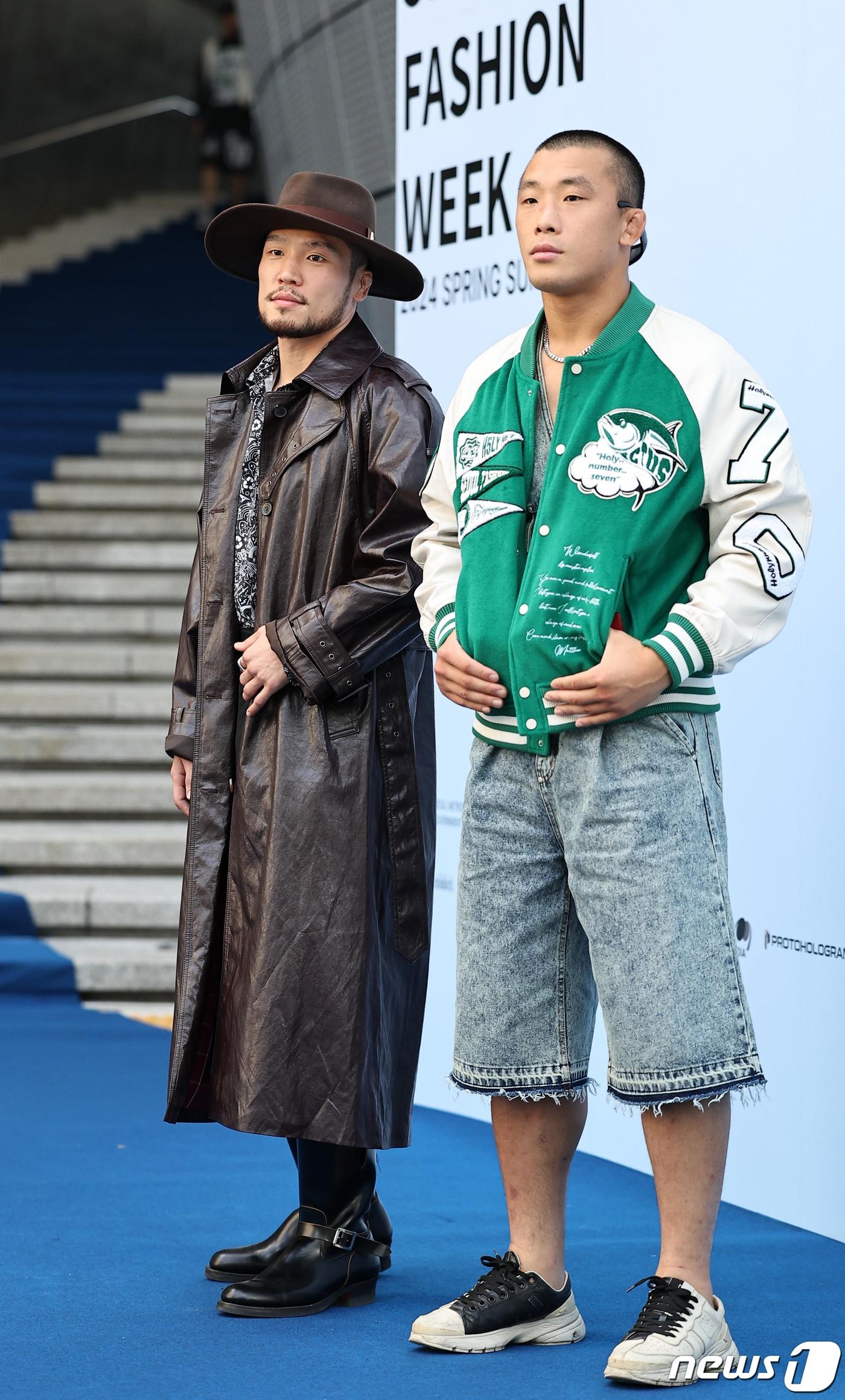 본문 이미지 - 격투기 선수 홍준영과 김상욱(오른쪽)이 5일 서울 중구 동대문 DDP에서 열린 ‘2024 S/S 서울패션위크’ 홀리넘버세븐(HOLYNUMBER7) 컬렉션에 참석해 포즈를 취하고 있다. 2023.9.5/뉴스1 ⓒ News1 김진환 기자