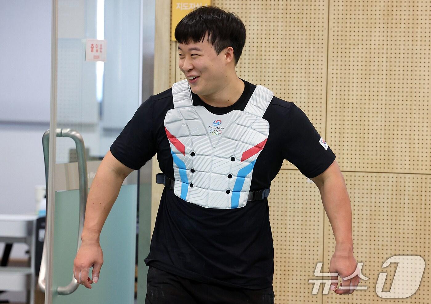 2024 파리하계올림픽을 한 달 앞둔 26일 오후 충북 진천군 광혜원면 선수촌로 진천국가대표선수촌 역도 국가대표팀 훈련장에서 장연학 선수가 훈련을 마친 뒤 쿨링 조끼를 입어보고 있다. 2024.6.26/뉴스1 ⓒ News1 박정호 기자