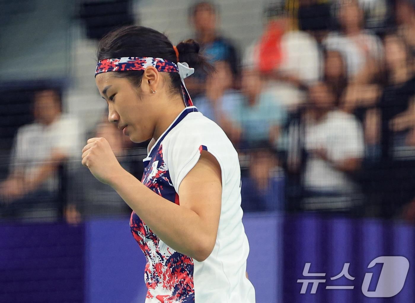대한민국 배드민턴 대표팀 안세영이 5일 오후(한국시간) 프랑스 파리 라 샤펠 아레나에서 열린 2024 파리올림픽 배드민턴 여자 단식 결승 중국의 허빙자오 선수와의 경기에서 득점한 후 기뻐하고 있다. 2024.8.5/뉴스1 ⓒ News1 박정호 기자