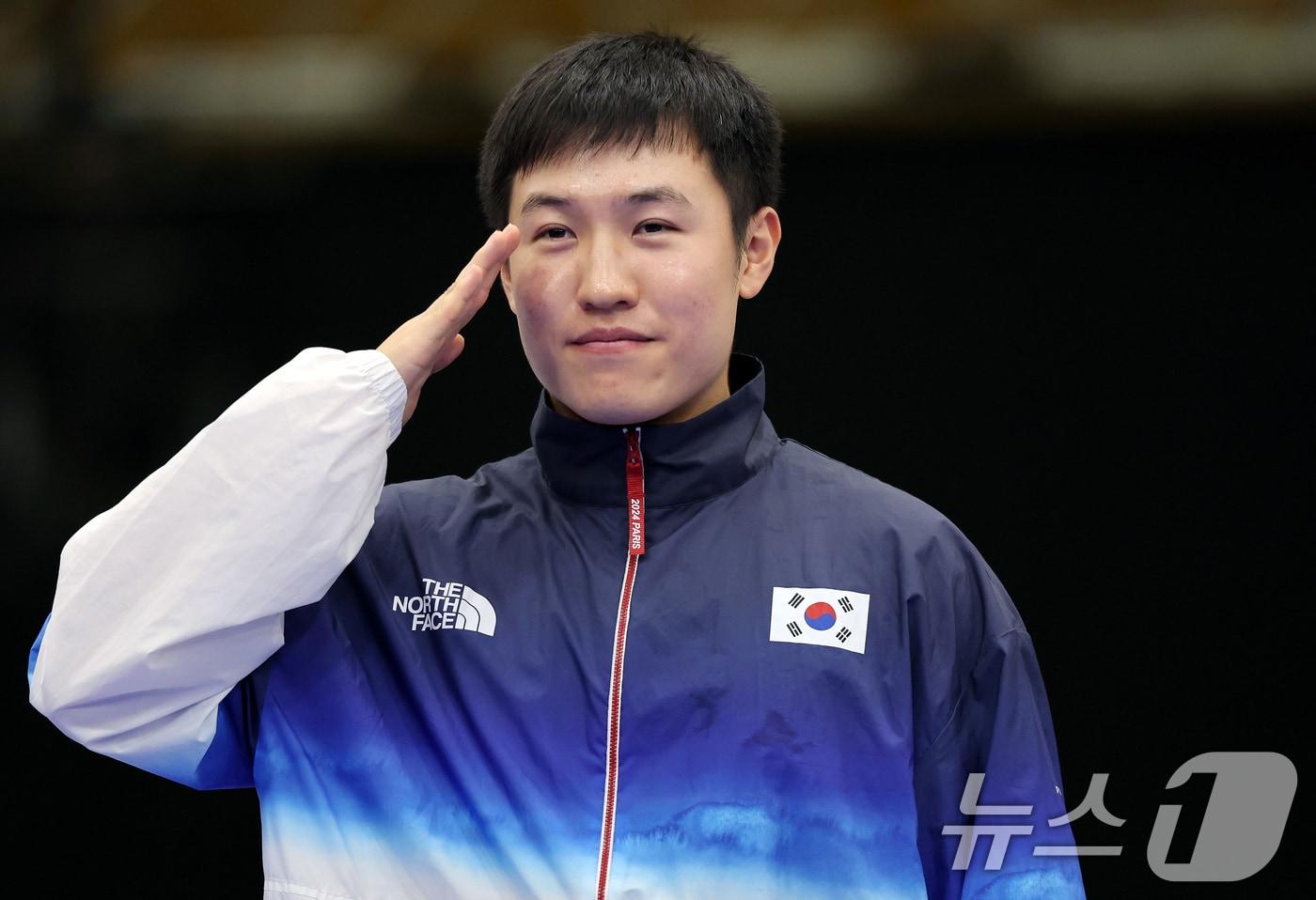 대한민국 사격 대표팀 조영재가 5일(한국시간) 프랑스 샤토루 슈팅 센터에서 열린 2024 파리올림픽 사격 25m 속사권총 시상식에서 시상대에 오르며 거수경례를 하고 있다. 2024.8.5/뉴스1 ⓒ News1 이동해 기자