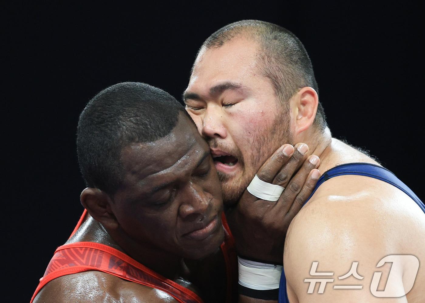 대한민국 레슬링 국가대표 이승찬 선수가 5일 오후(한국시간) 프랑스 파리 샹 드 마르스 아레나에서 진행된 레슬링 남자 그레코로만형 130kg급 16강 경기에서 쿠바의 미하인 로페즈 선수와 자웅을 겨루고 있다. 2024.8.5/뉴스1 ⓒ News1 박정호 기자