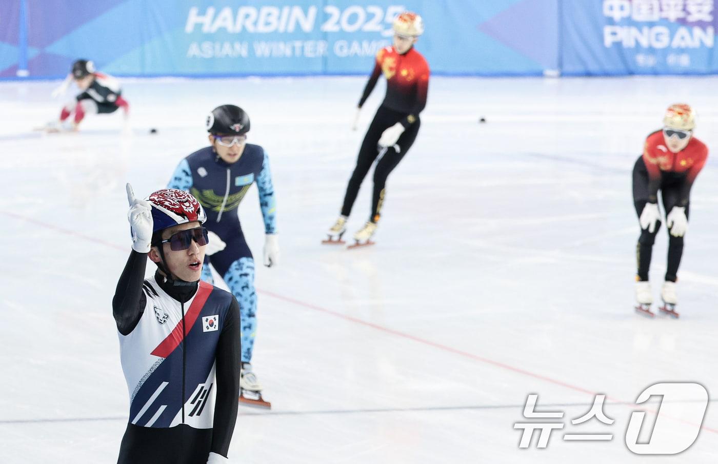 8일(현지시간) 중국 헤이룽장성 하얼빈 빙상훈련센터 다목적홀에서 열린 하얼빈 동계아시안게임 쇼트트랙 혼성 2,000m 계주 결승에서 대표팀 마지막 주자 박지원이 금메달을 확정한 뒤 중국 대표팀 린샤오쥔 앞을 지나고 있다. 2025.2.8/뉴스1 ⓒ News1 이승배 기자