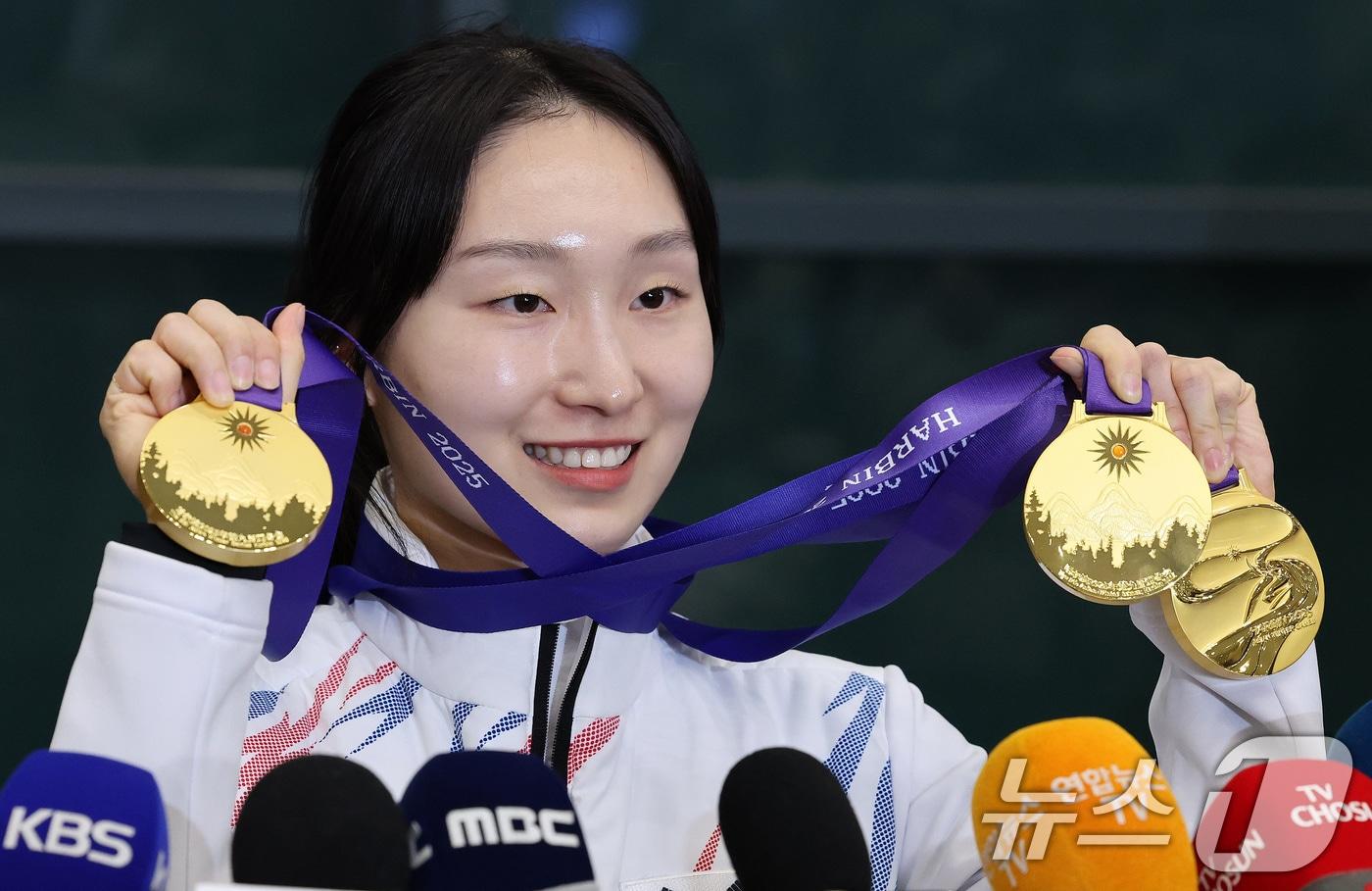 쇼트트랙 국가대표 최민정 선수가 제9회 하얼빈 동계아시안게임 출전을 마치고 10일 오후 인천국제공항을 통해 귀국해 취재진과 인터뷰를 마치고 금메달을 들어보이고 있다. 쇼트트랙 국가대표팀은 이번 대회에서 금메달 6개, 은메달 4개, 동메달 3개를 수확했다. 2025.2.10/뉴스1 ⓒ News1 박세연 기자