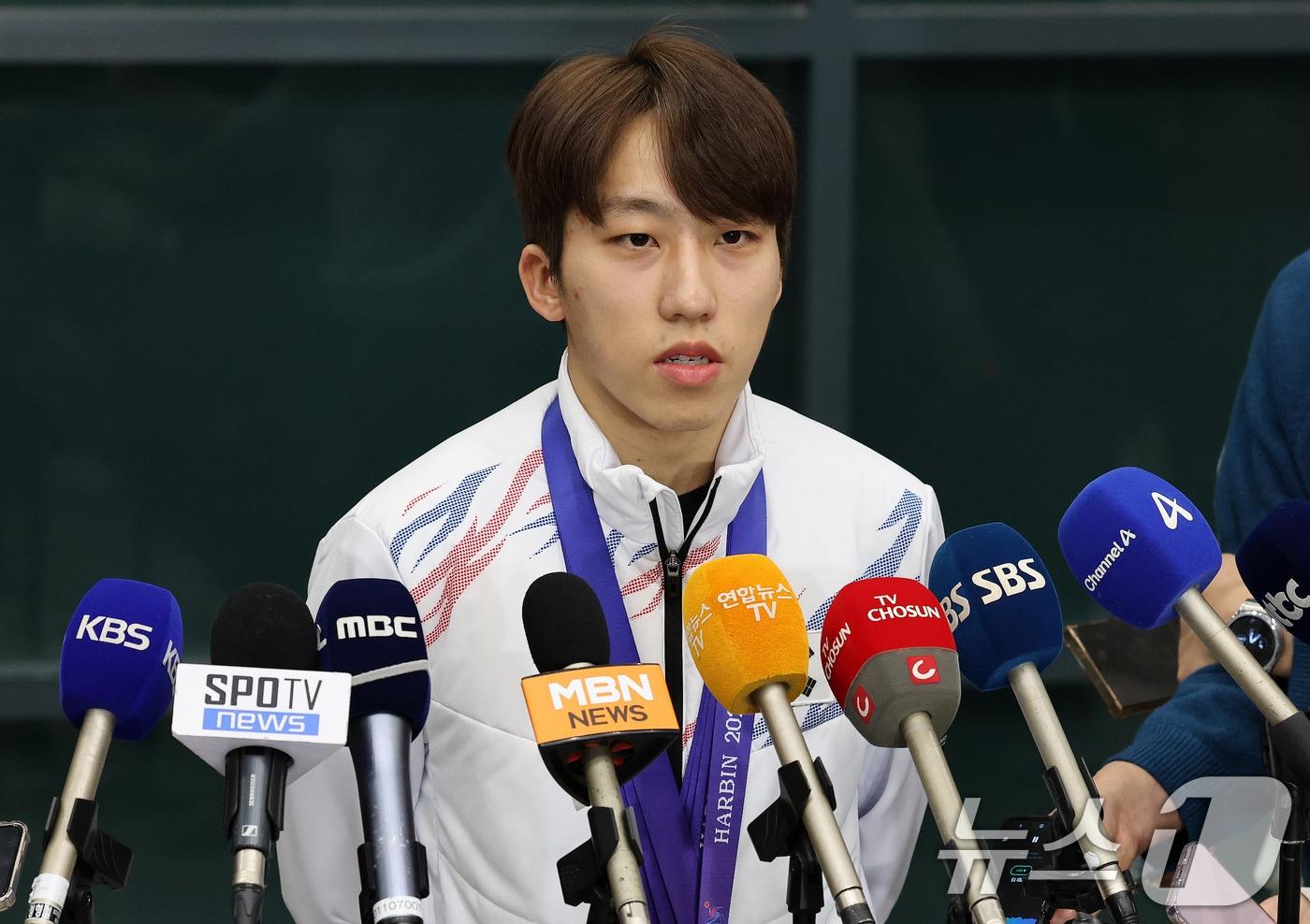 쇼트트랙 국가대표 박지원 선수가 제9회 하얼빈 동계아시안게임 출전을 마치고 10일 오후 인천국제공항을 통해 귀국해 취재진과 인터뷰를 하고 있다. 쇼트트랙 국가대표팀은 이번 대회에서 금메달 6개, 은메달 4개, 동메달 3개를 수확했다. 2025.2.10/뉴스1 ⓒ News1 박세연 기자