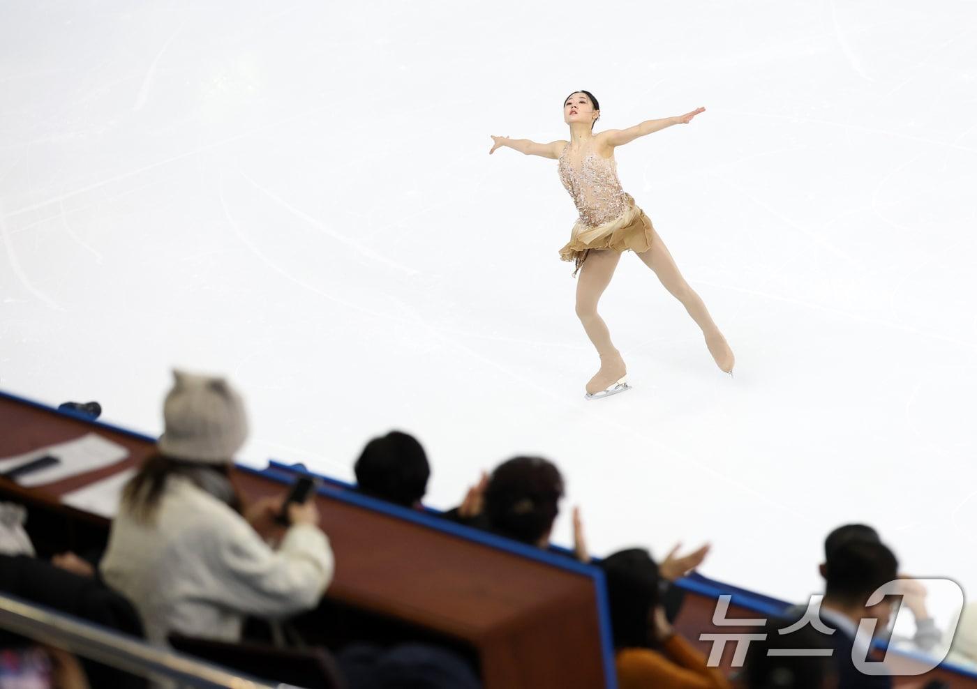 피겨 김채연이 13일 중국 헤이룽장성 하얼빈 빙상훈련센터 다목적홀에서 열린 하얼빈 동계아시안게임 피겨 여자 싱글 프리스케이팅에서 연기를 펼치고 있다. 김채연은 피겨 여자 싱글 프리스케이팅에서 기술점수(TES) 79.07점, 예술점수(PCS) 68.49점을 합쳐 총점 147.56점을 받았다. 그는 쇼트 프로그램 71.88점을 합한 최종 총점 219.44점으로 사카모토 가오리(일본·211.90점)를 누르고 우승했다.2025.2.13/뉴스1 ⓒ News1 이승배 기자
