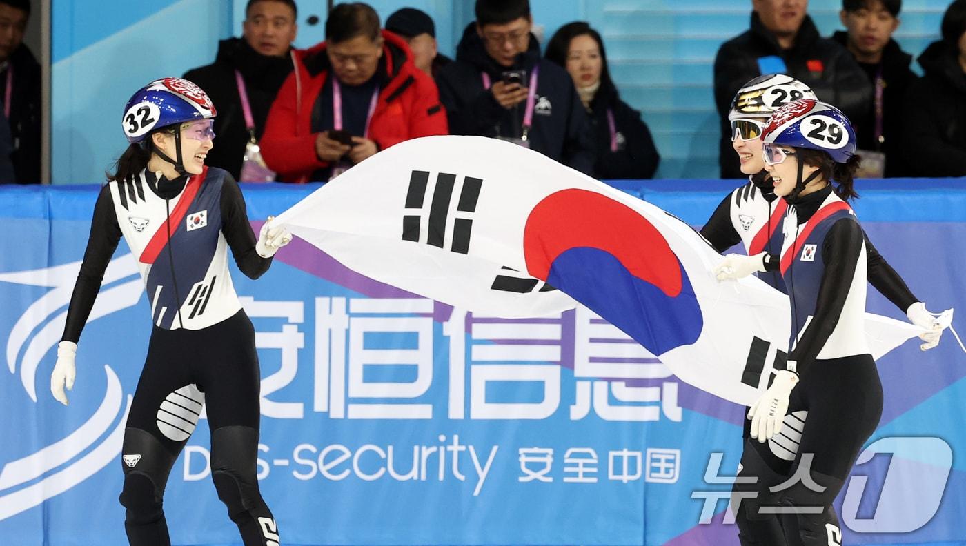8일(현지시간) 중국 헤이룽장성 하얼빈 빙상훈련센터 다목적홀에서 열린 하얼빈 동계아시안게임 쇼트트랙 여자 500m 결승에서 최민정, 김길리, 이소연이 금, 은, 동메달을 모두 차지하는 올 포디움을 달성한 후 태극기를 휘날리고 있다. 2025.2.8/뉴스1 ⓒ News1 이승배 기자