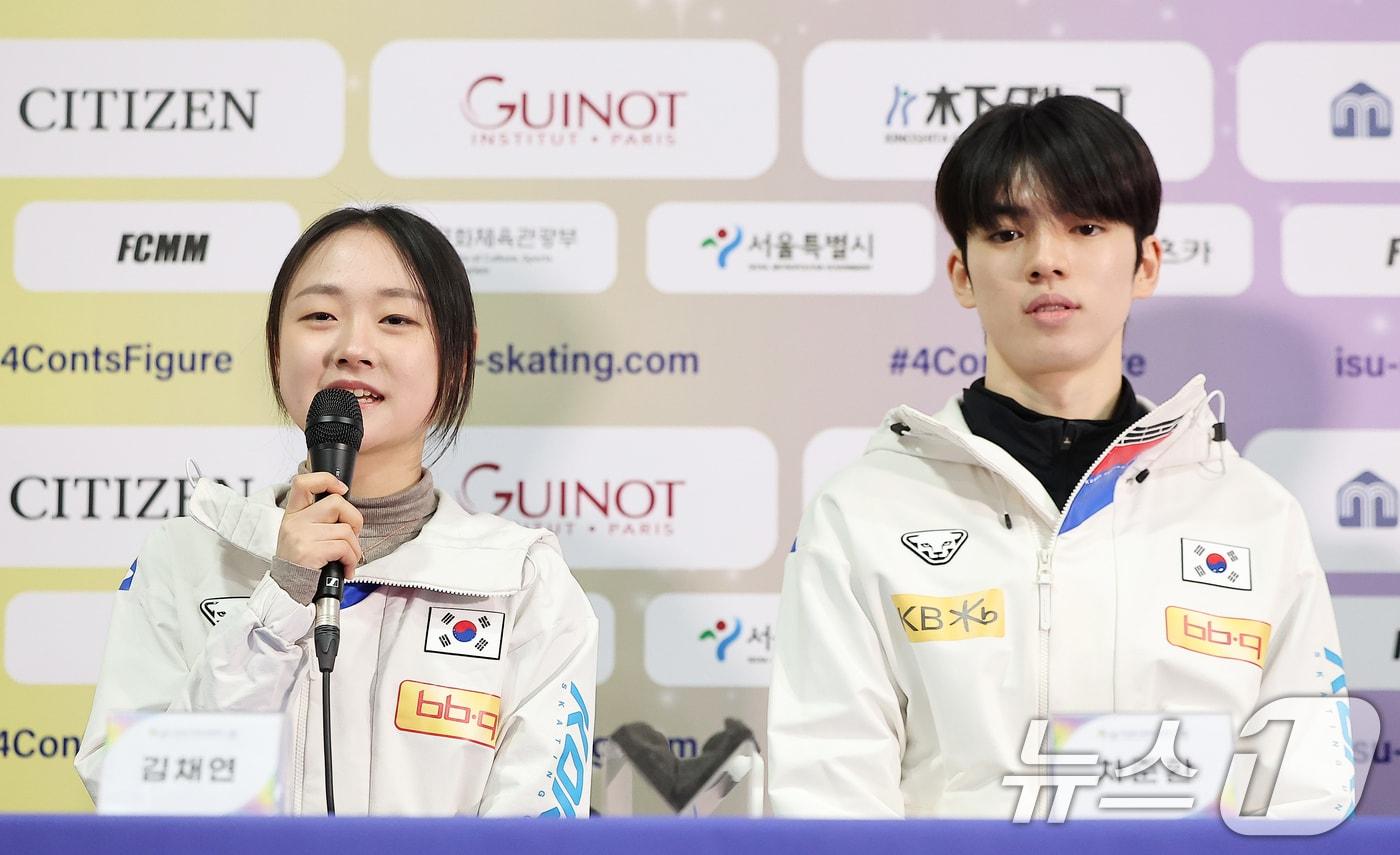 피겨 대표팀 김채연이 18일 오후 서울 양천구 목동 아이스링크 프레스센터에서 열린 2025 ISU 사대륙 피겨스케이팅 선수권대회 한국 선수단 미디어데이에 참석해 인사말을 하고 있다. 2025.2.18/뉴스1 ⓒ News1 김진환 기자