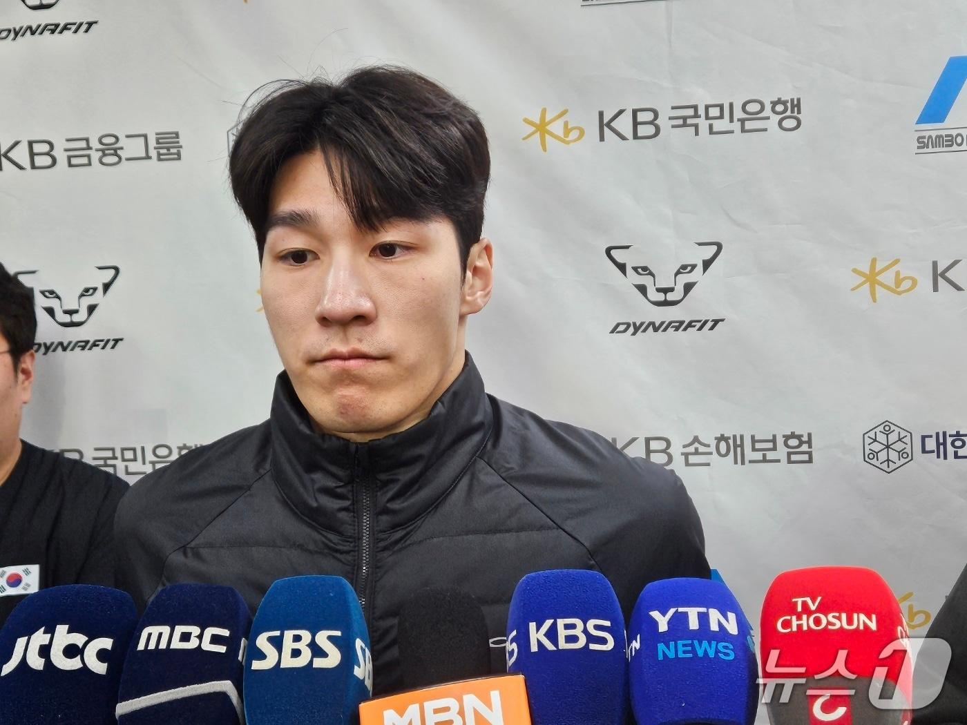 황대헌(빨간색 헬멧·강원도청)이 12일 오후 서울 양천구 목동실내빙상장에서 열린 '2024-2025시즌 쇼트트랙 국가대표 2차 선발대회' 남자부 1000m 준준결승 코너링에서 넘어진 뒤 항의하고 있다. 황대헌은 01:26.217의 기록으로 준준결승 2조 4위를 기록했다.2024.4.12/뉴스1 ⓒ News1 이동해 기자