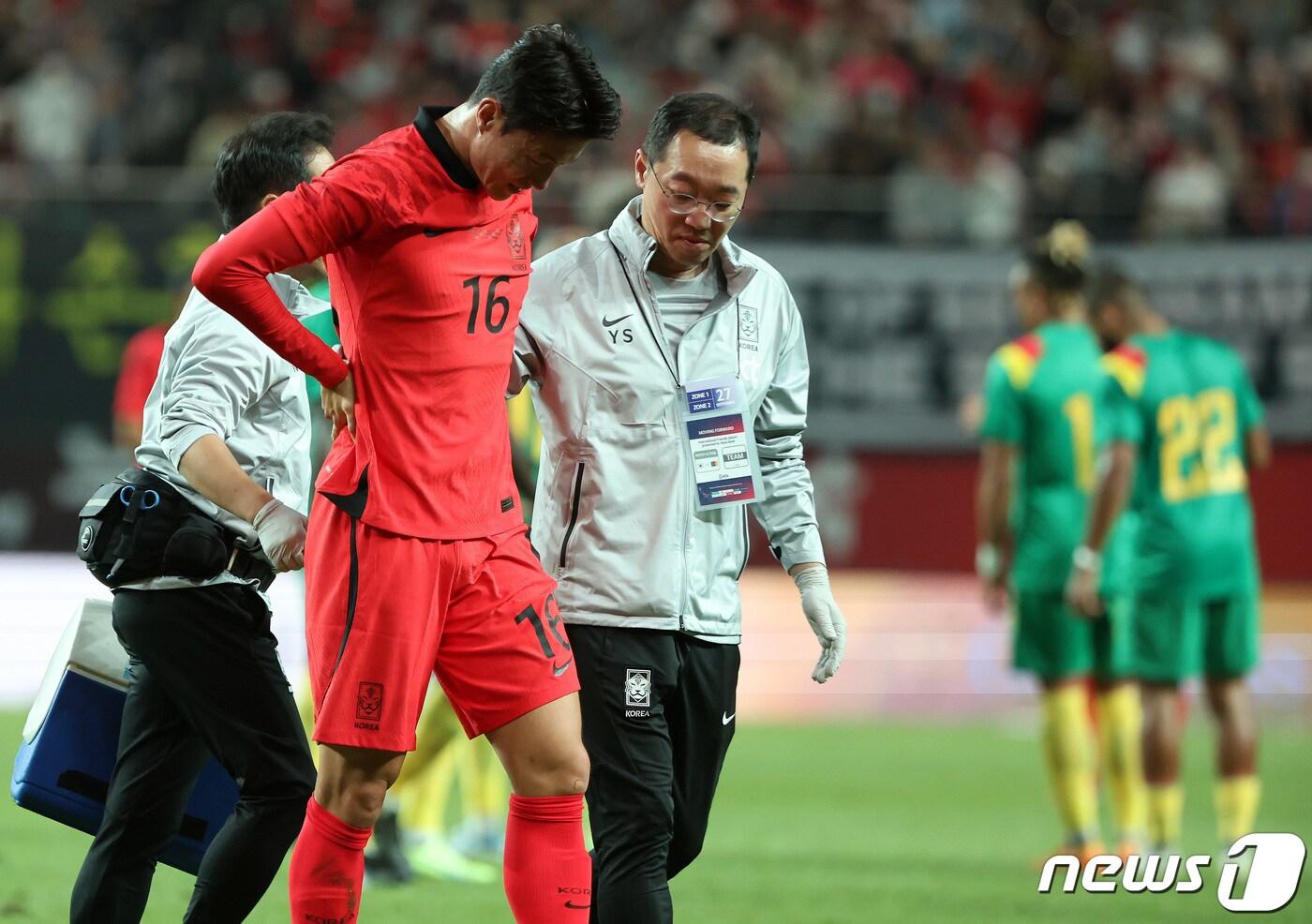교체 투입된 황의조가 27일 오후 서울 마포구 상암동 서울월드컵경기장에서 열린 대한민국과 카메룬의 친선경기 후반전에서 고통을 호소하며 경기장을 빠져나가고 있다. 2022.9.27/뉴스1 ⓒ News1 이동해 기자