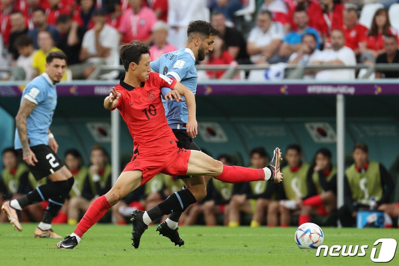 이재성이 24일 오후(현지시간) 카타르 알라이얀 에듀케이션 시티 스타디움에서 열린 2022 카타르 월드컵 조별리그 H조 1차전 대한민국과 우루과이의 경기에서 볼다툼을 하고 있다. 2022.11.25/뉴스1 ⓒ News1 이광호 기자