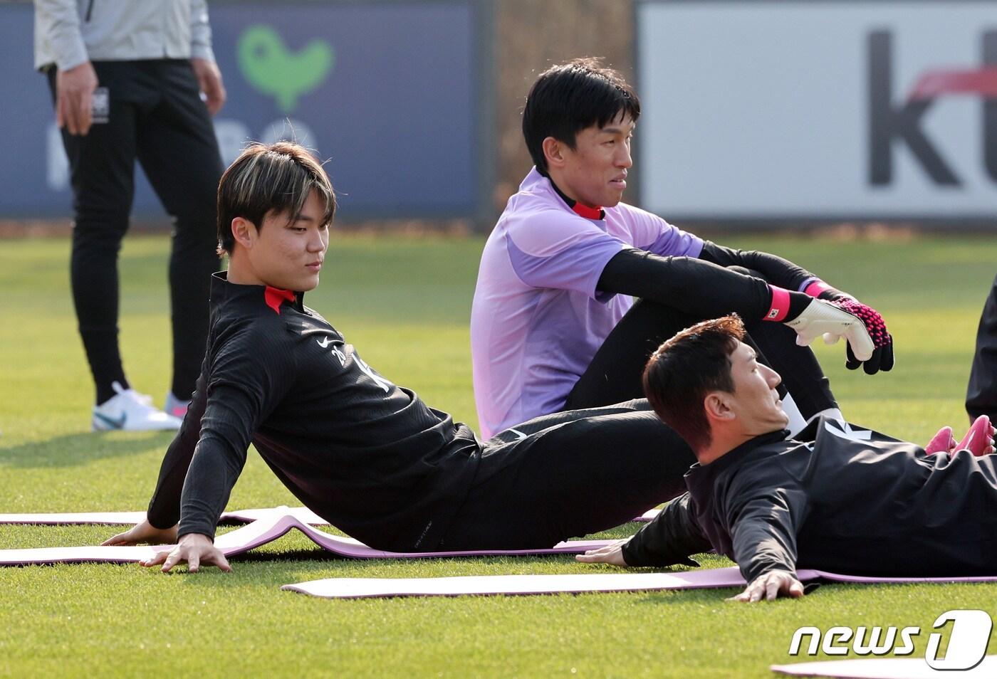 축구 국가대표팀 오현규(왼쪽부터), 김승규, 정우영이 20일 오후 경기 파주트레이닝센터(NFC)에서 첫 소집훈련을 하고 있다. 클린스만호는 오는 24일 울산에서 콜롬비아, 28일 서울에서 우루과이와 A매치 평가전을 갖는다. 2022.3.20/뉴스1 ⓒ News1 구윤성 기자