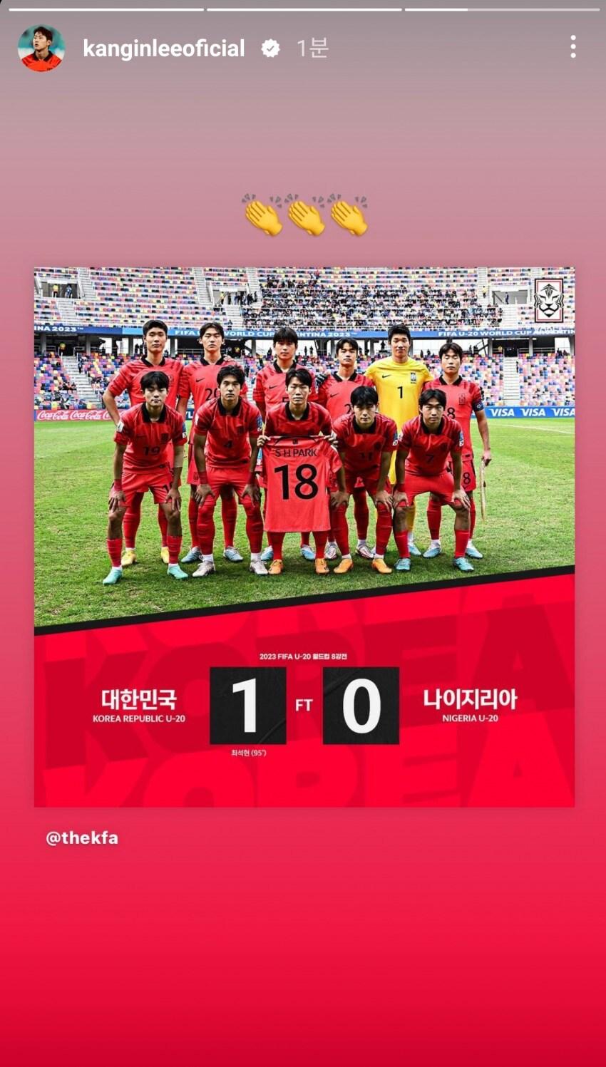 한국, 나이지리아 꺾고 2연속 대회 4강 진출이강인은 A대표팀 발탁, 6월 국내 2연전 소화이강인이 후배들의 U20 월드컵 4강 진출 소식에 박수 갈채를 보냈다.(이강인 SNS 캡처)관련 키워드이강인U20 월드컵4강 신화나이지리아이탈리아이상철 기자 '거듭된 졸전' 이민성호, U23 아시안컵 8강 호주와 격돌'강동희 아들' KT 강성욱, 데뷔 최다 20점 펄펄…팀은 KCC 완파관련 기사2019 준우승·2023 4강 이어…또 다른 U20 축구 신화가 시작된다