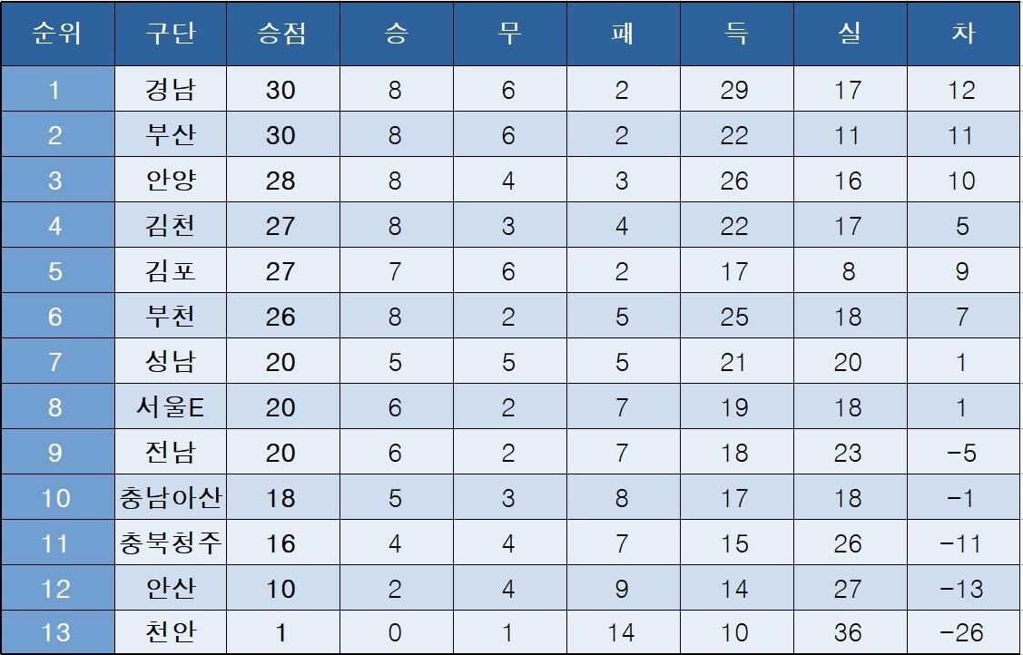 [K리그2] 중간 순위(10일)