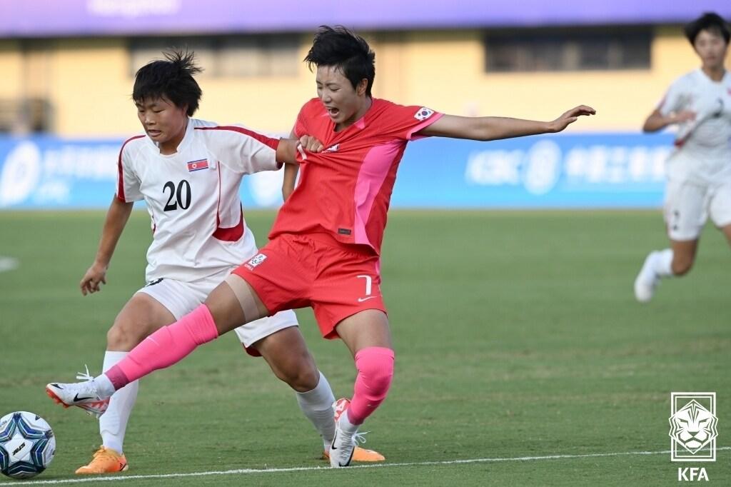 항저우 AG 노메달, 파리 올림픽 예선 탈락 부진 영향 '여자 월드컵 우승' 스페인, 사상 첫 1위 등극30일 중국 원저우 스포츠센터 스타디움에서 열린 2022 항저우 아시안게임 여자축구 8강전 한국과 북한의 경기, 손화연이 북한선수와 볼경합을 하고 있다. (대한축구협회 제공) 2023.9.30/뉴스1관련 키워드여자축구FIFA 랭킹20위9위북한일본이상철 기자 '공식 인터뷰 불참' 강혁 가스공사 감독, KBL 재정위 회부스포츠윤리센터, 2025 스포츠윤리 시상식 개최관련 기사한국 여자축구, 올해 첫 FIFA 랭킹 19위…일본은 5위'추효주 멀티골' 여자축구, 핑크레이디스컵 첫판 우즈벡 완파여자 축구대표팀, 2월 UAE 친선 대회 참가…4월에는 호주 원정