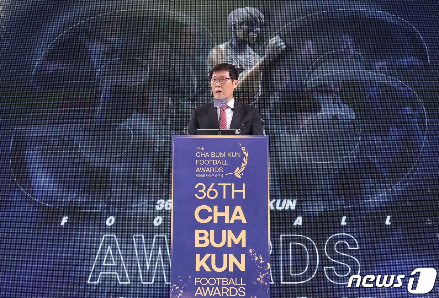 차범근 ‘차범근 축구교실’ 회장이 29일 오전 서울 종로구 HW컨벤션센터 열린 ‘제36회 차범근 축구상' 시상식에서 축사를 하고 있다. 차범근축구상은 1988년 시작돼 매년 훌륭한 활약을 펼친 한국 축구선수 꿈나무를 발굴해 시상하는 유소년 축구상이다. 2024.2.29/뉴스1 ⓒ News1 김진환 기자