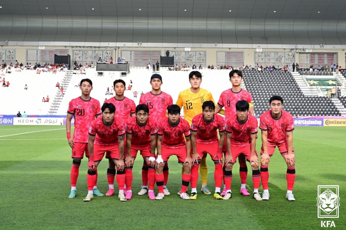22일(현지시간) 카타르 도하 자심 빈 하마드 스타디움에서 열린 2024 아시아축구연맹(AFC) U23 아시안컵 B조 조별리그 최종전 한국과 일본의 경기에 앞서 대한민국 베스트 일레븐이 기념 촬영을 하고 있다. (축구협회 제공) 2024.4.22/뉴스1 ⓒ News1 유승관 기자