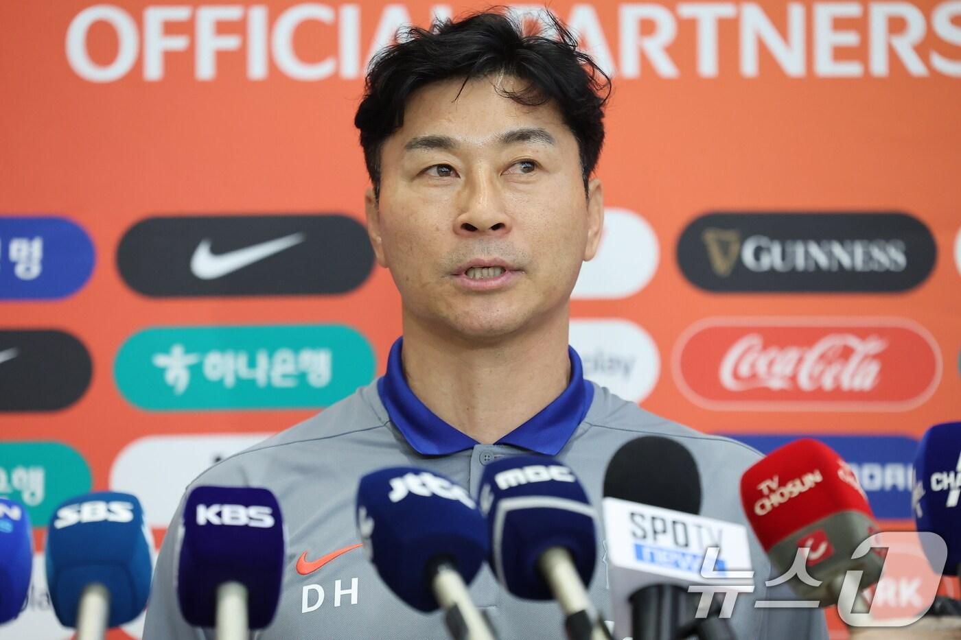 김도훈 대한민국 축구 국가대표팀 임시감독이 7일 오전 인천국제공항 제2터미널을 통해 귀국하며 취재진 질문에 답하고 있다. 대표팀은 지난 6일(한국시간) 싱가포르 내셔널 스타디움에서 열린 싱가포르와의 2026 북중미 월드컵 아시아 2차 예선 C조 5차전에서 7-0 승리를 거뒀다. 2024.6.7/뉴스1 ⓒ News1 김도우 기자