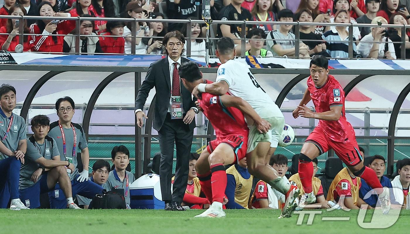 5일 오후 서울 마포구 서울월드컵경기장에서 열린 2026 국제축구연맹(FIFA) 북중미 월드컵 아시아 3차 예선 B조 1차전 대한민국과 팔레스타인의 경기, 후반 홍명보 축구대표팀 감독이 선수들에게 작전을 지시하고 있다. 2024.9.5/뉴스1 ⓒ News1 김진환 기자