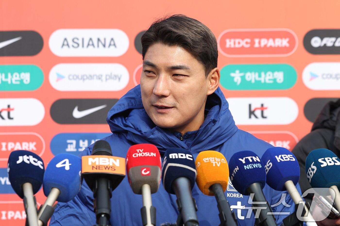 대한민국 축구대표팀 주민규가 17일 오후 경기도 고양시 고양종합운동장에서 3월 A매치 대비 첫 훈련에 앞서 취재진과 인터뷰를 하고 있다. 축구대표팀은 오는 20일 오만, 25일은 요르단을 상대로 2026 국제축구연맹(FIFA) 북중미 월드컵 아시아 3차 예선 B조 7·8차전을 갖는다. 2025.3.17/뉴스1 ⓒ News1 민경석 기자