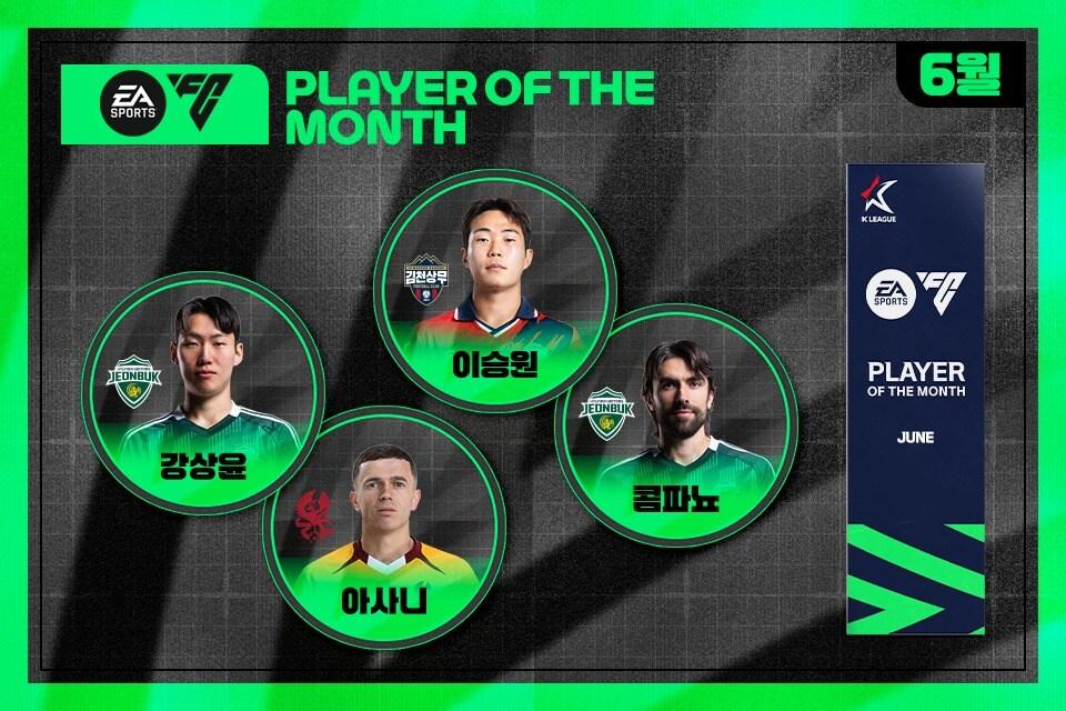 10일부터 13일까지 팬 투표 진행K리그 6월의 최우수선수(MVP) 후보인 강상윤, 콤파뇨, 아사니, 이승원.(한국프로축구연맹 제공)관련 키워드K리그1이달의 선수강상윤아사니이승원콤파뇨김도용 기자 "쇼트트랙은 대한민국이란 걸 증명할 것"…대표팀, 당찬 새해 각오"밀라노·나고야에서 일 낸다"…진천선수촌 새해 아침을 여는 선수들 열정관련 기사전북 콤파뇨, K리그 6월 이달의 선수 선정…이달의 골은 강원 김대원남녀 축구 동아시안컵 출전 새 얼굴은 누구?…오늘 명단 발표