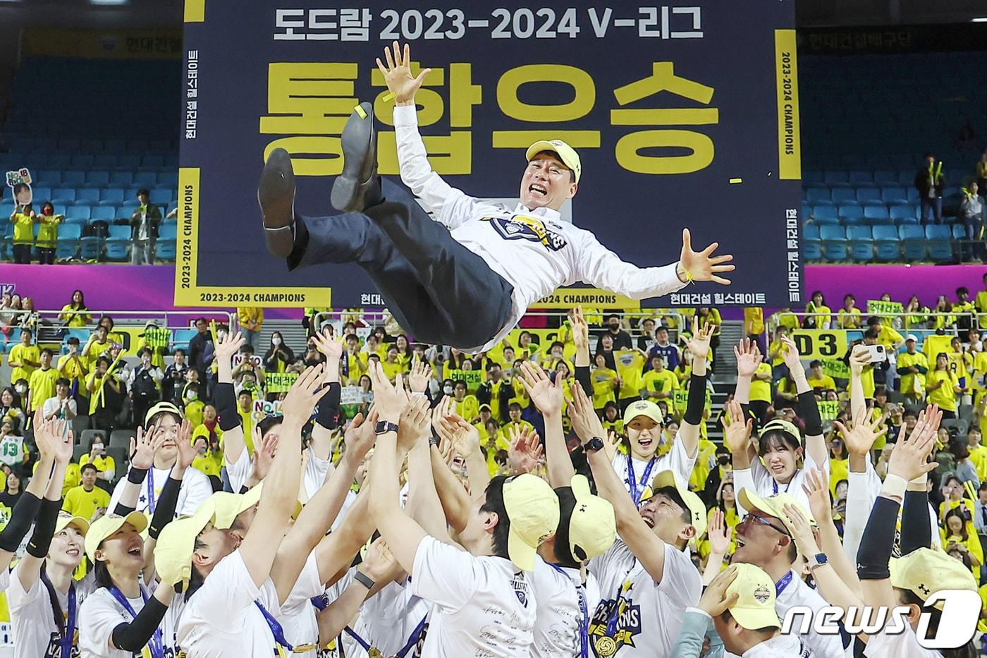 1일 오후 인천 삼산월드체육관에서 열린 프로 배구 도드람 2023-24 V리그 여자부 챔피언 결정전 3차전 현대건설과 흥국생명의 경기에서 세트 스코어 3대2로 승리한 현대건설 선수들이 강성형 감독을 헹가래 치고 있다. 2024.4.1/뉴스1 ⓒ News1 김민지 기자