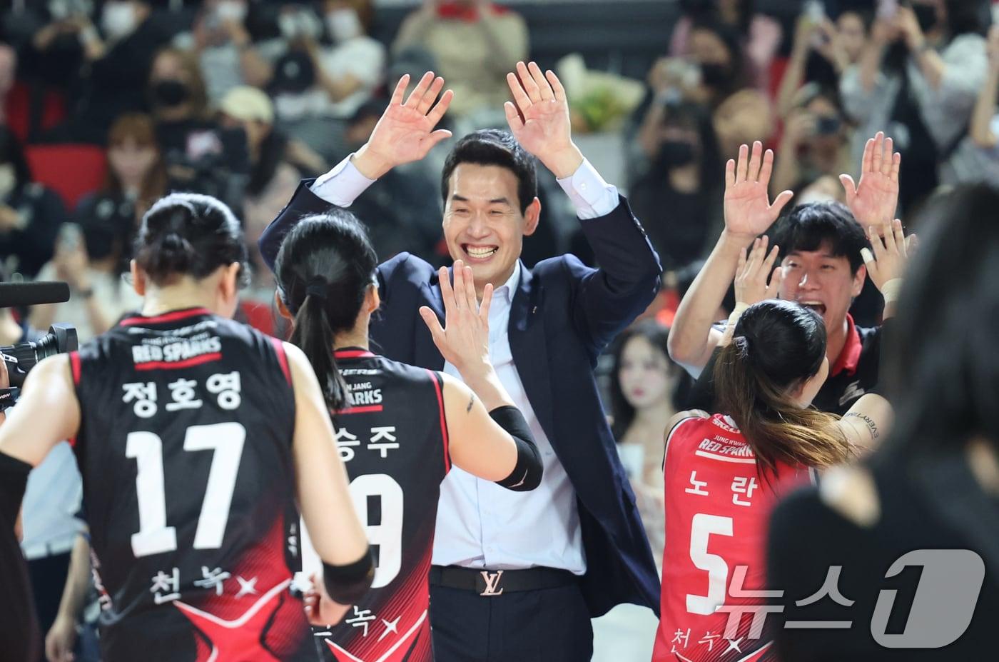 4일 오후 대전 중구 충무실내체육관에서 열린 프로배구 '2024-2025 도드람 V리그' 여자부 챔피언결정전 3차전, 정관장과 흥국생명의 경기에서 세트 스코어 3대2로 승리한 정관장 고희진 감독이 선수들과 기쁨을 나누고 있다. 2025.4.4/뉴스1 ⓒ News1 김영운 기자