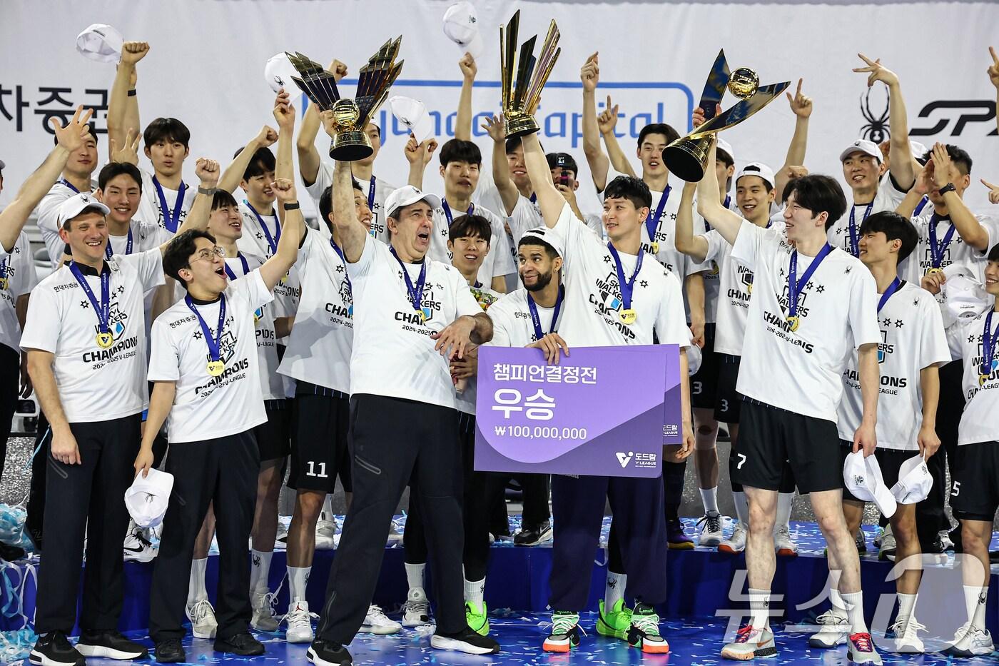 5일 인천 계양체육관에서 열린 프로배구 '2024-2025 도드람 V리그' 남자부 챔피언결정전 3차전 현대캐피탈과 대한항공의 경기, 세트스코어 3대1 승리로 우승을 차지한 현대캐피탈 선수들과 필립 블랑 감독이 트로피를 들어올리며 기뻐하고 있다. 2025.4.5/뉴스1 ⓒ News1 김도우 기자