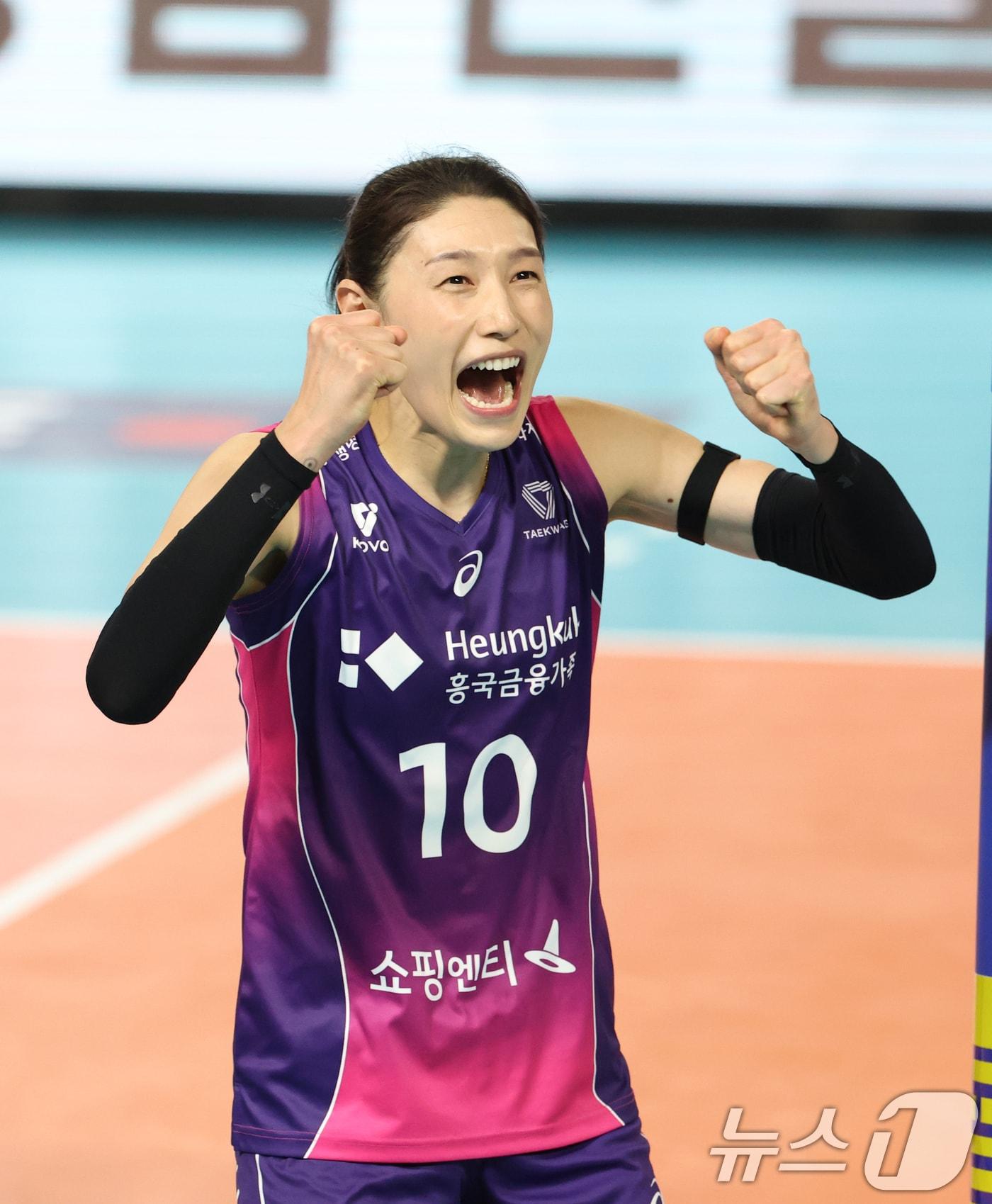 4일 오후 대전 중구 충무실내체육관에서 열린 프로배구 '2024-2025 도드람 V리그' 여자부 챔피언결정전 3차전, 정관장과 흥국생명의 경기에서 흥국생명 김연경이 비디오판독 결과를 확인한 뒤 기뻐하고 있다. 2025.4.4/뉴스1 ⓒ News1 김영운 기자