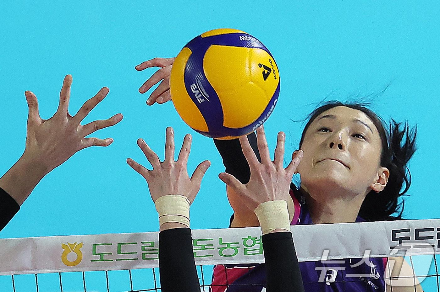 6일 오후 대전 중구 충무체육관에서 열린 프로배구 '2024-2025 도드람 V리그' 여자부 챔피언결정전 4차전, 정관장과 흥국생명의 경기에서 흥국생명 정윤주가 공격을 펼치고 있다. 2025.4.6/뉴스1 ⓒ News1 박정호 기자