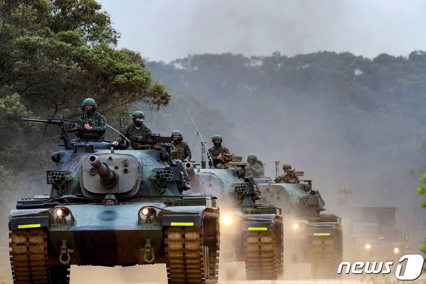9일(현지시간) 차이잉원 대만 총통과 케빈 매카시 미국 하원의장의 회동에 반발한 중국의 포위 훈련에 대응해 대만 군이 탱크 기동 훈련을 하고 있다. ⓒ AFP=뉴스1 ⓒ News1 우동명 기자